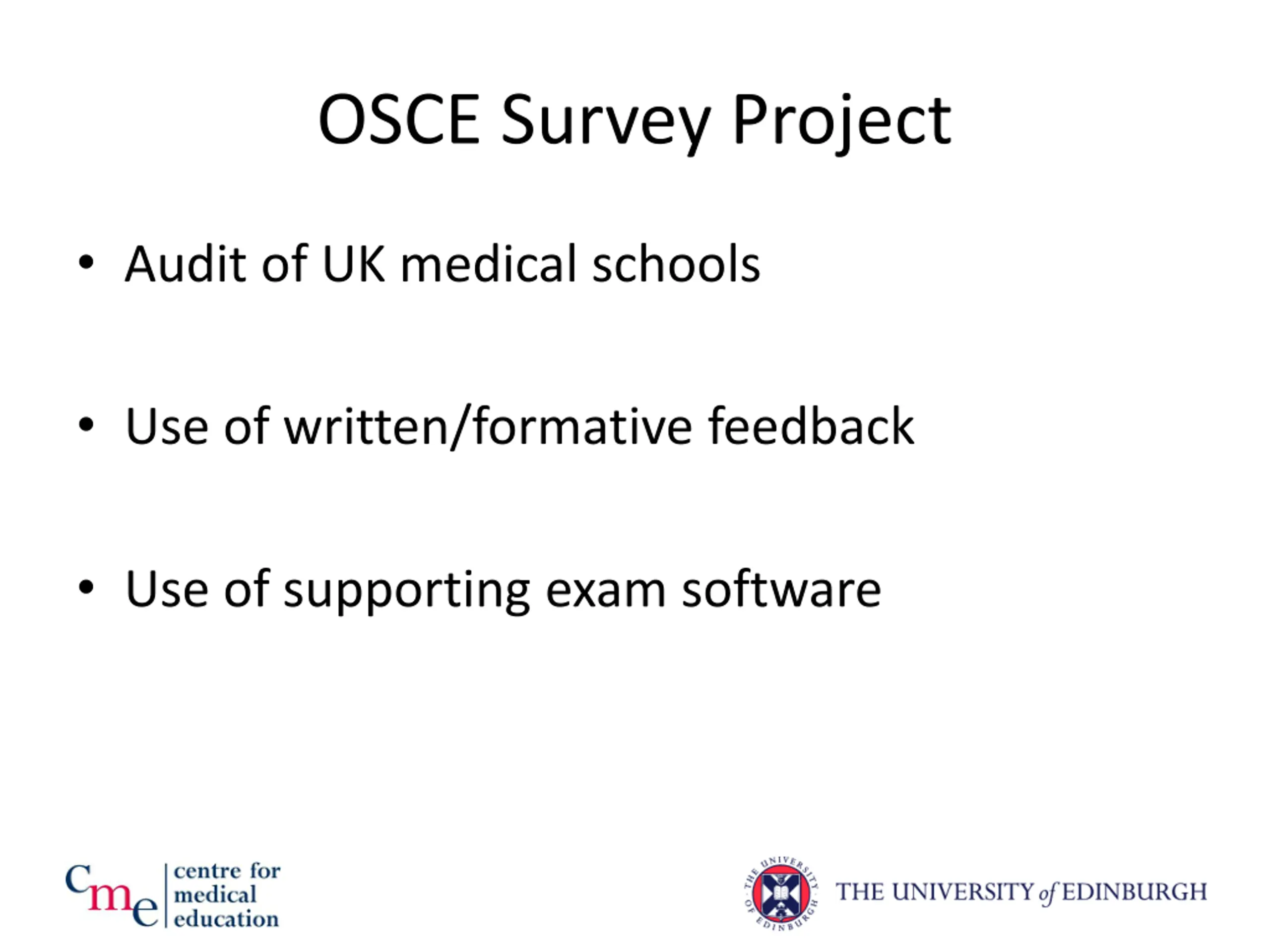 OSCE Survey Project Audit of UK medical schools Use of written/formative feedback Use of supporting exam software