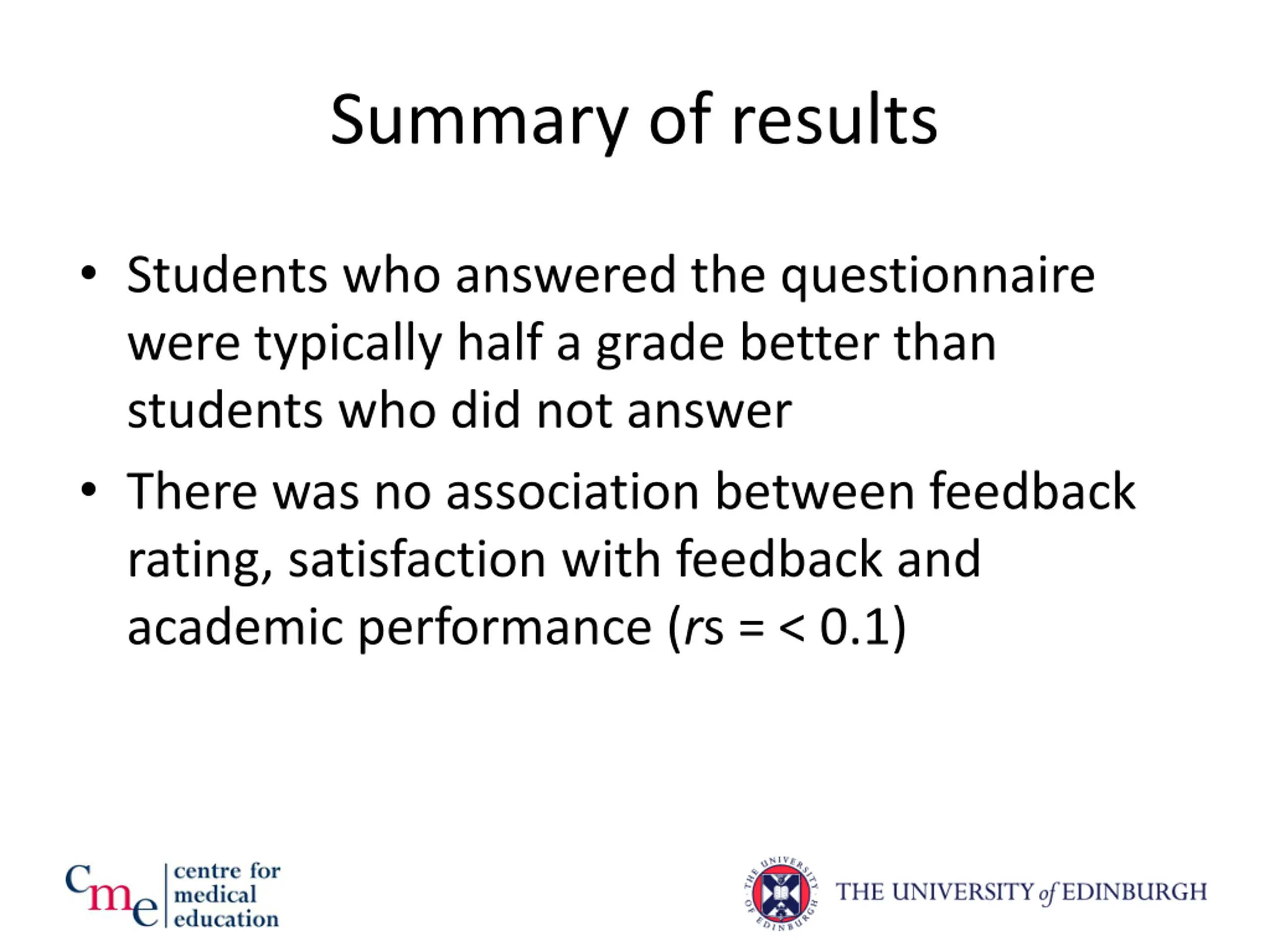 Summary of results Students who answered the questionnaire were typically half a grade better than students who did not answer There was no association between feedback rating, satisfaction with feedback and academic performance (rs = < 0.1)