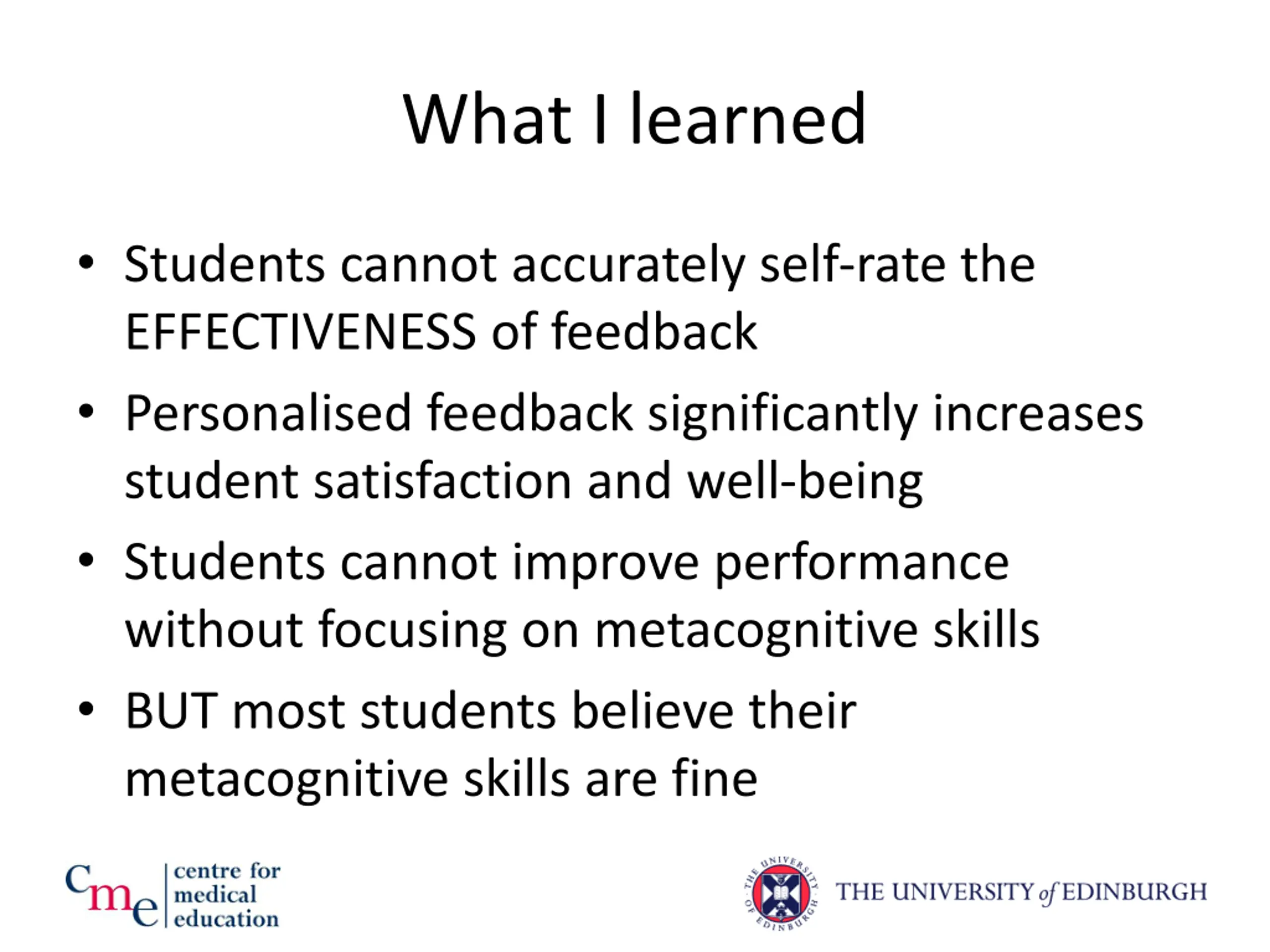 What I learned Students cannot accurately self-rate the EFFECTIVENESS of feedback Personalised feedback significantly increases student satisfaction and well-being Students cannot improve performance without focusing on metacognitive skills BUT most students believe their metacognitive skills are fine
