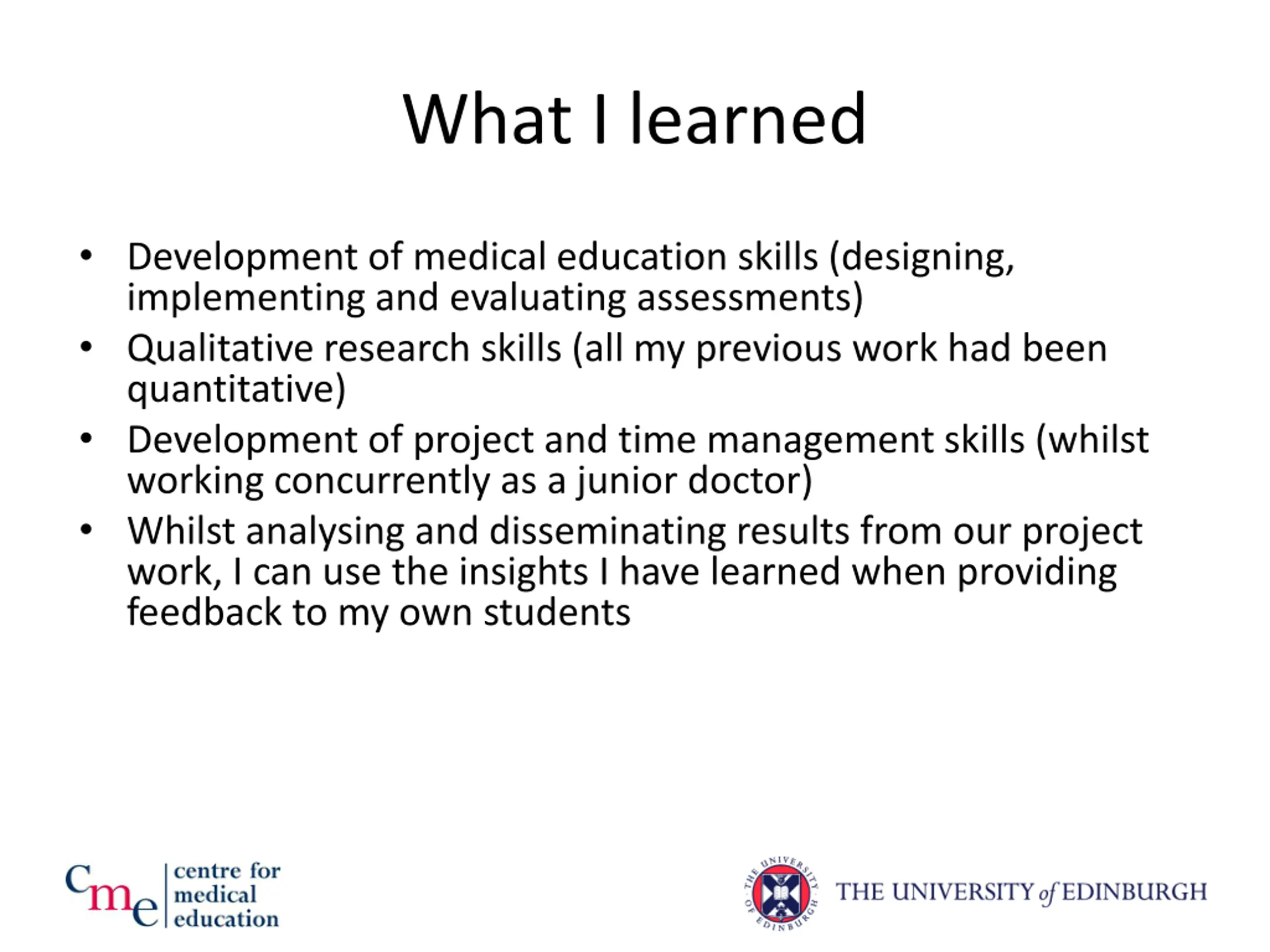 What I learned Development of medical education skills (designing, implementing and evaluating assessments) Qualitative research skills (all my previous work had been quantitative) Development of project and time management skills (whilst working concurrently as a junior doctor) Whilst analysing and disseminating results from our project work, I can use the insights I have learned when providing feedback to my own students