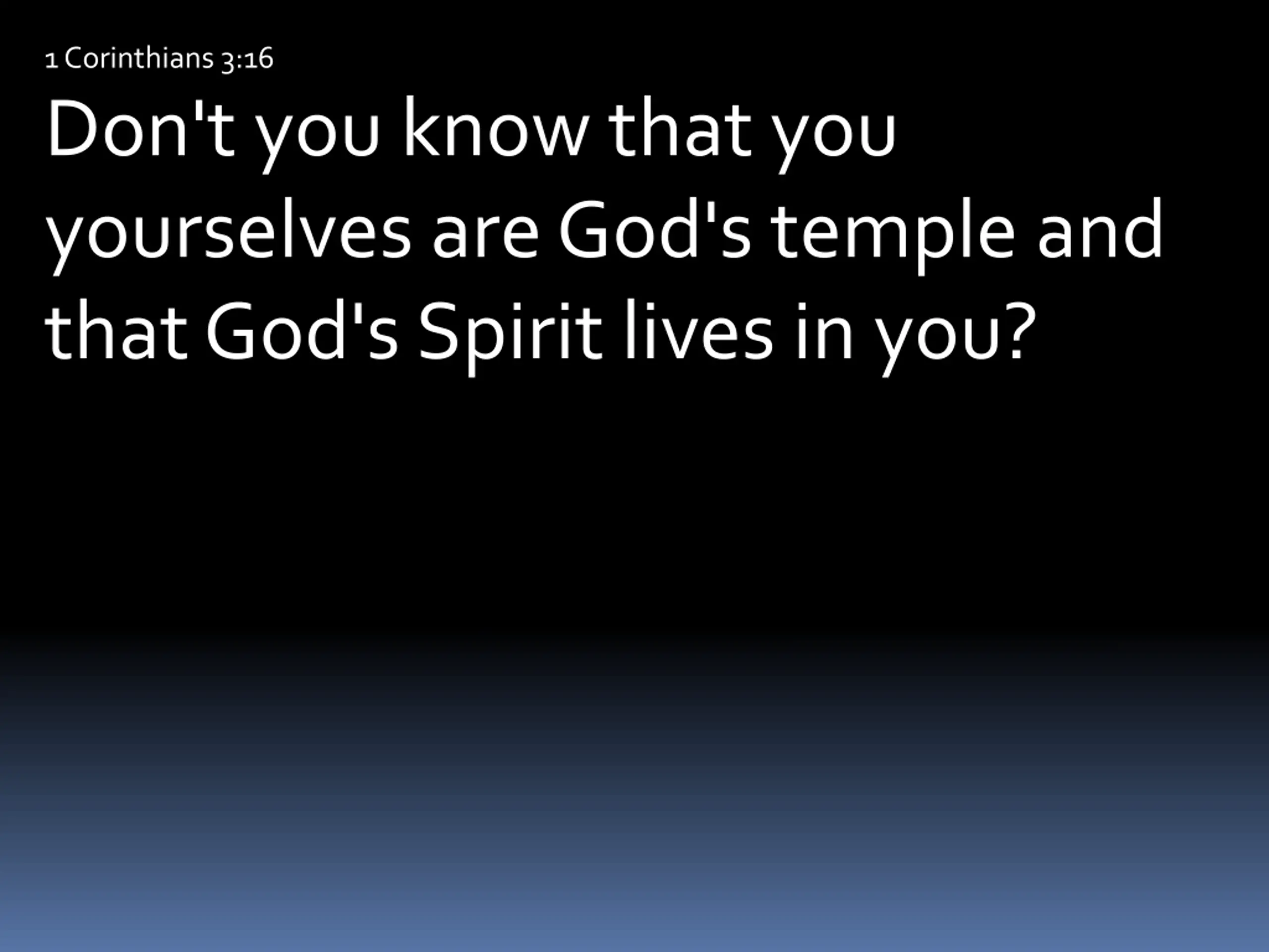 1 Corinthians 3:16 Don't you know that you yourselves are God's temple and that God's Spirit lives in you?