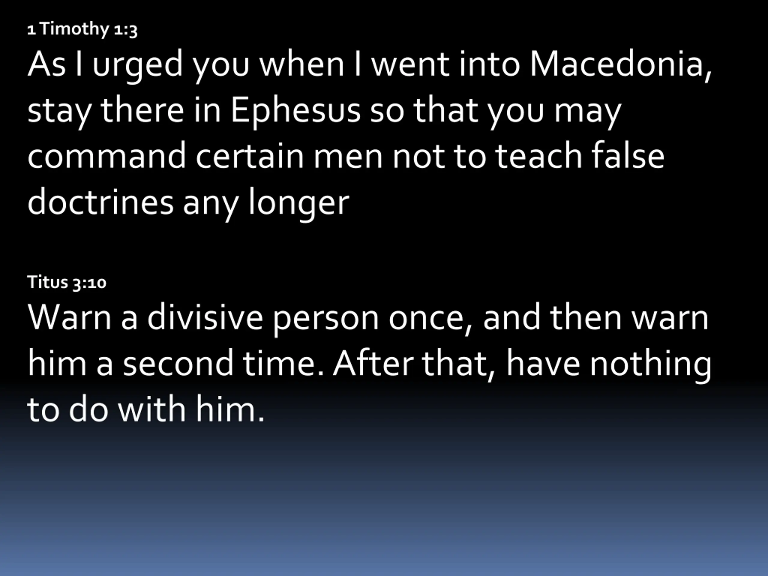1 Timothy 1:3 As I urged you when I went into Macedonia, stay there in Ephesus so that you may command certain men not to teach false doctrines any longer Titus 3:10 Warn a divisive person once, and then warn him a second time. After that, have nothing to do with him.