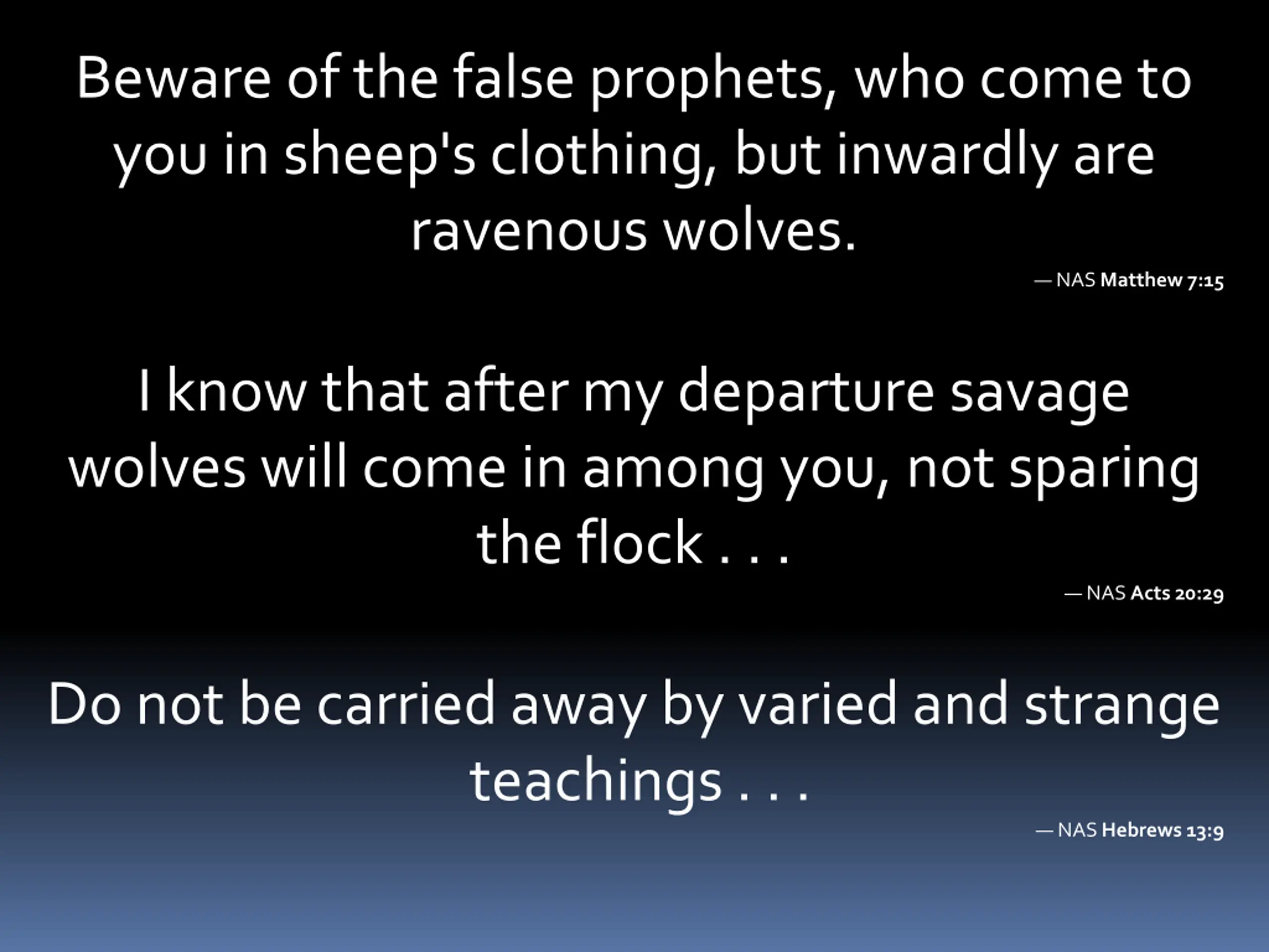 Beware of the false prophets, who come to you in sheep's clothing, but inwardly are ravenous wolves. NAS Matthew 7:15 I know that after my departure savage wolves will come in among you, not sparing the flock . . . NAS Acts 20:29 Do not be carried away by varied and strange teachings . . . NAS Hebrews 13:9