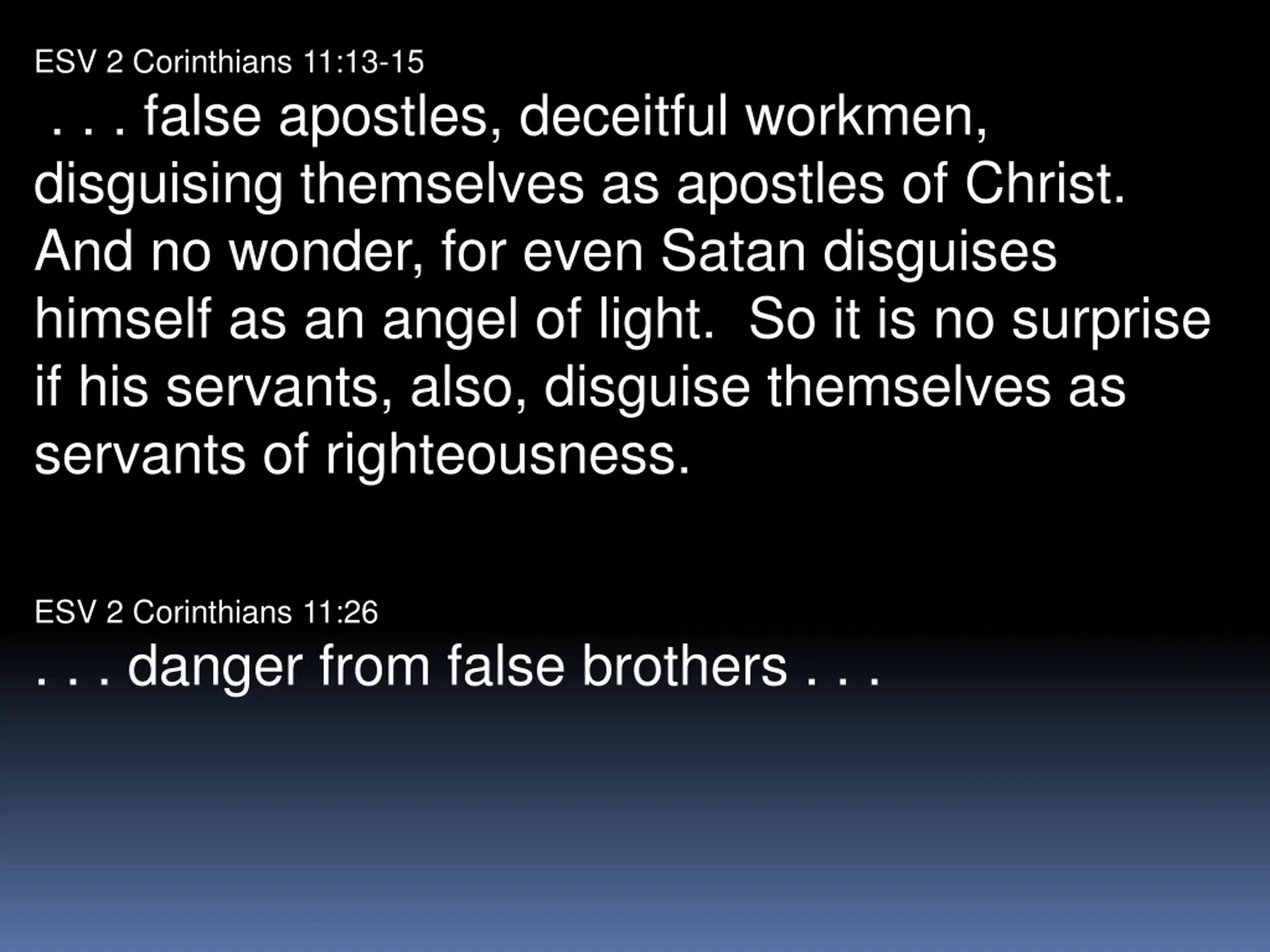 ESV 2 Corinthians 11:13-15 . . . false apostles, deceitful workmen, disguising themselves as apostles of Christ. And no wonder, for even Satan disguises himself as an angel of light. So it is no surprise if his servants, also, disguise themselves as servants of righteousness. ESV 2 Corinthians 11:26 . . . danger from false brothers . . .