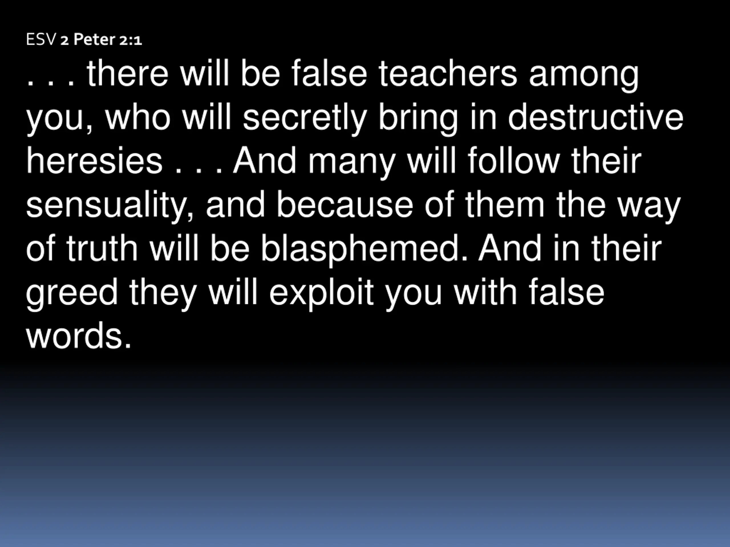 ESV 2 Peter 2:1 . . . there will be false teachers among you, who will secretly bring in destructive heresies . . . And many will follow their sensuality, and because of them the way of truth will be blasphemed. And in their greed they will exploit you with false words.