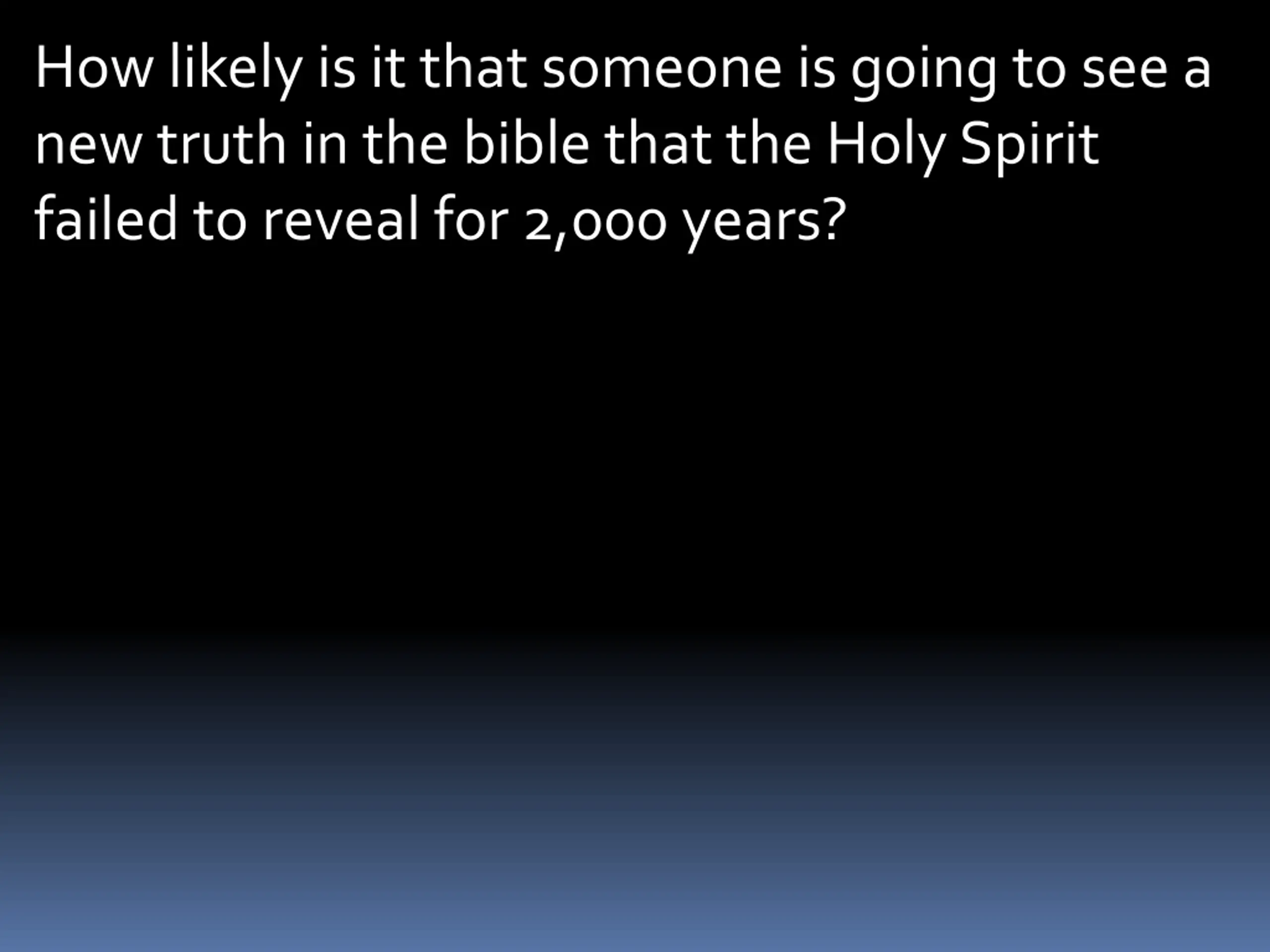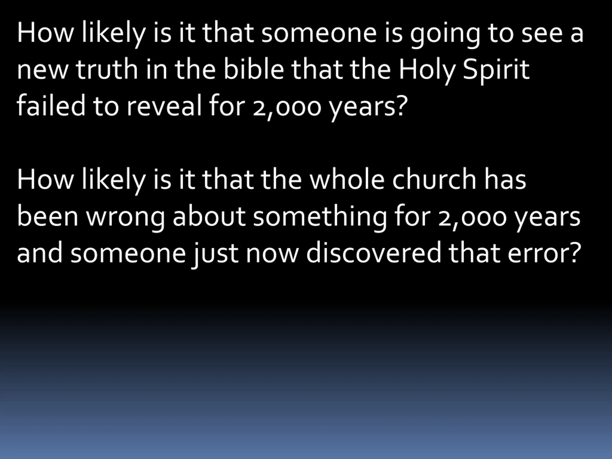 How likely is it that someone is going to see a new truth in the bible that the Holy Spirit failed to reveal for 2,000 years? How likely is it that the whole church has been wrong about something for 2,000 years and someone just now discovered that error?