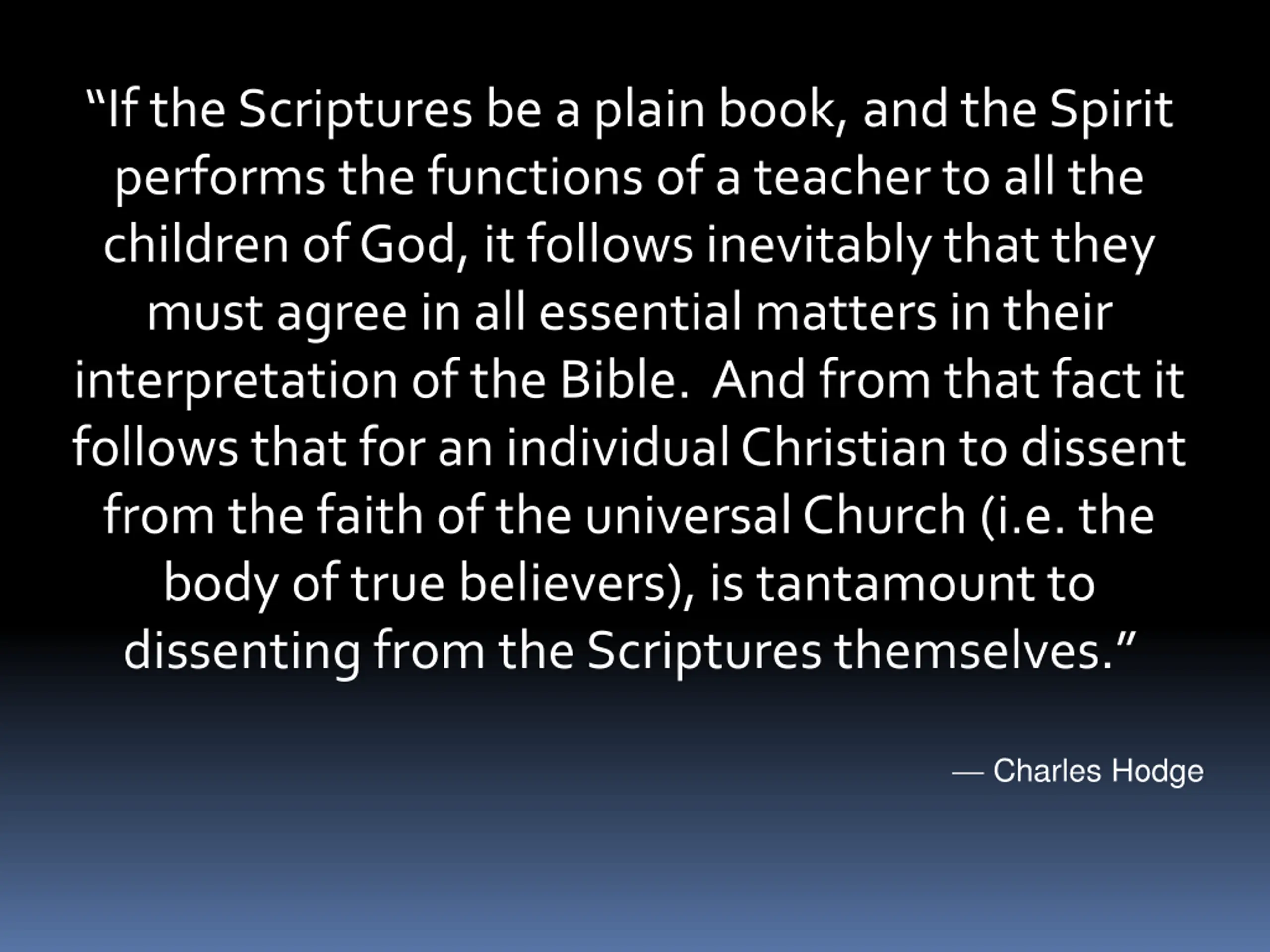 If the Scriptures be a plain book, and the Spirit performs the functions of a teacher to all the children of God, it follows inevitably that they must agree in all essential matters in their interpretation of the Bible. And from that fact it follows that for an individual Christian to dissent from the faith of the universal Church (i.e. the body of true believers), is tantamount to dissenting from the Scriptures themselves. Charles Hodge
