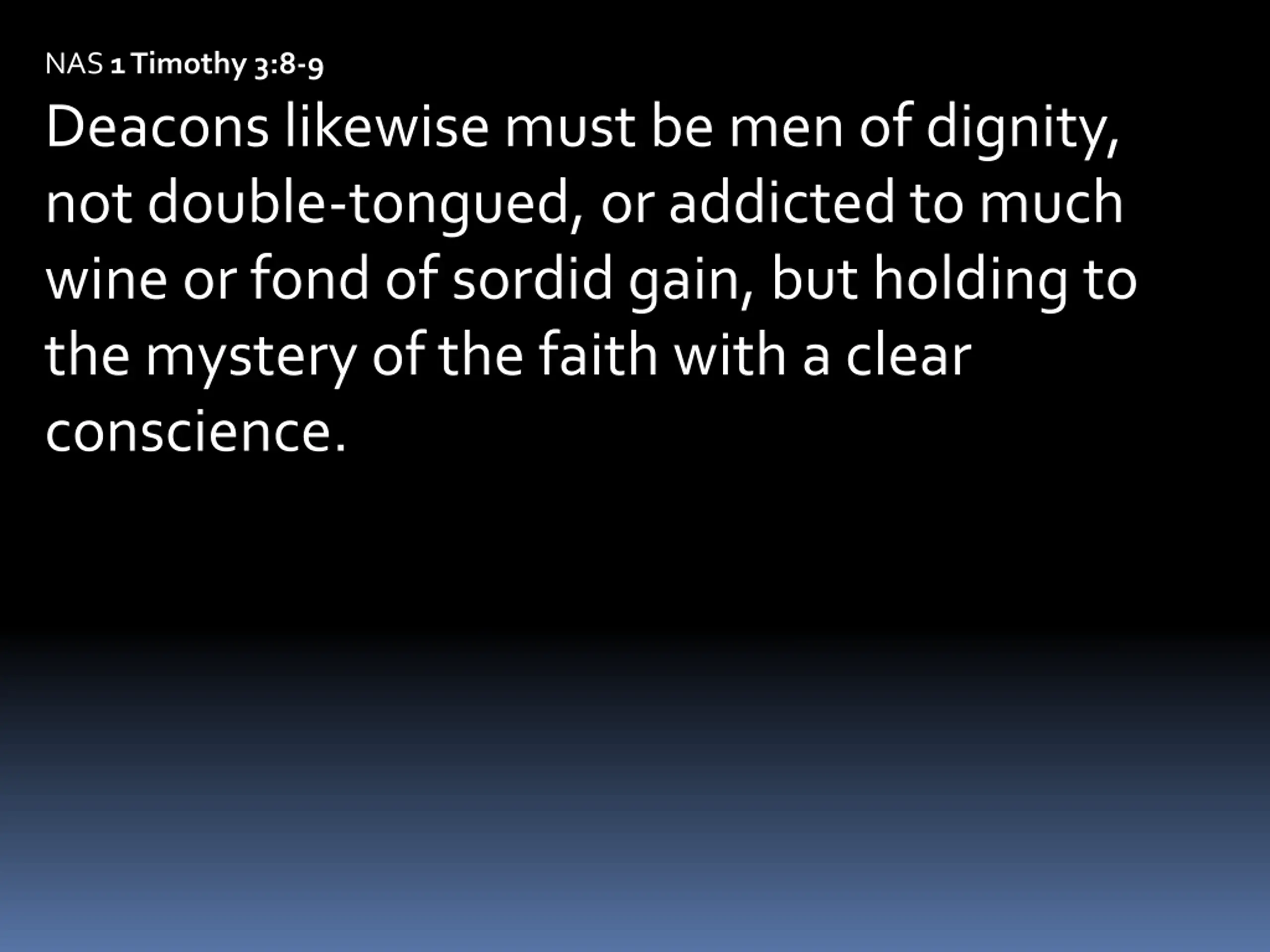 NAS 1 Timothy 3:8-9 Deacons likewise must be men of dignity, not double-tongued, or addicted to much wine or fond of sordid gain, but holding to the mystery of the faith with a clear conscience.