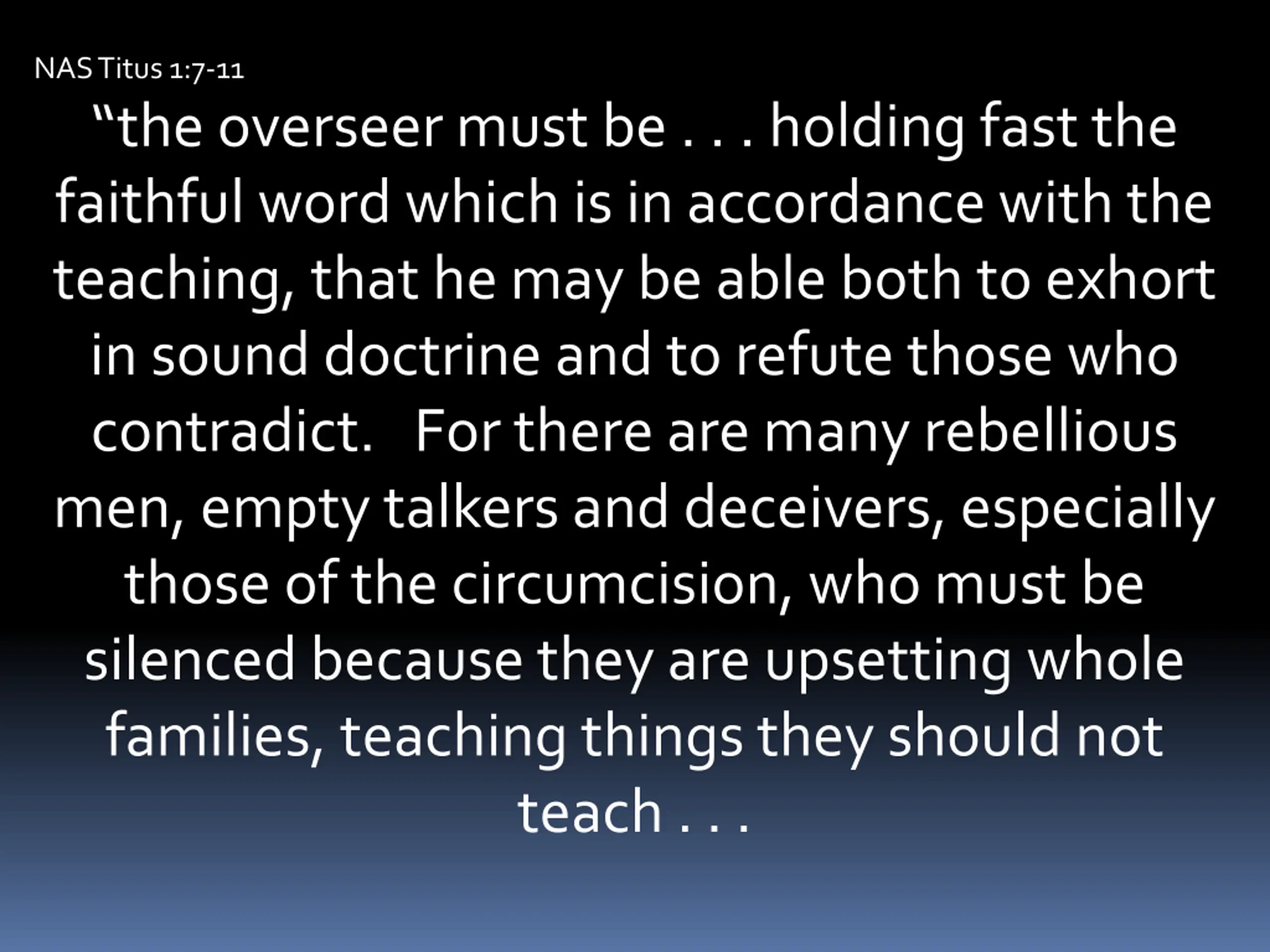 NAS Titus 1:7-11 the overseer must be . . . holding fast the faithful word which is in accordance with the teaching, that he may be able both to exhort in sound doctrine and to refute those who contradict. For there are many rebellious men, empty talkers and deceivers, especially those of the circumcision, who must be silenced because they are upsetting whole families, teaching things they should not teach . . .