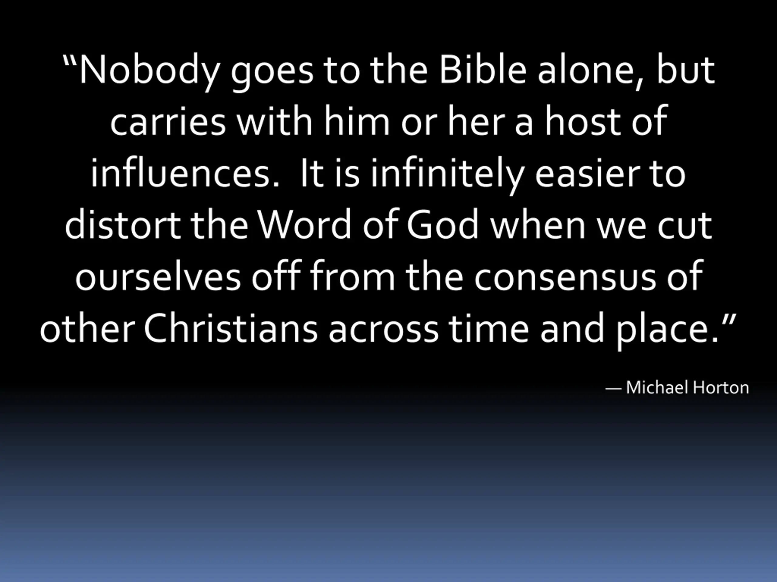 Nobody goes to the Bible alone, but carries with him or her a host of influences. It is infinitely easier to distort the Word of God when we cut ourselves off from the consensus of other Christians across time and place. Michael Horton