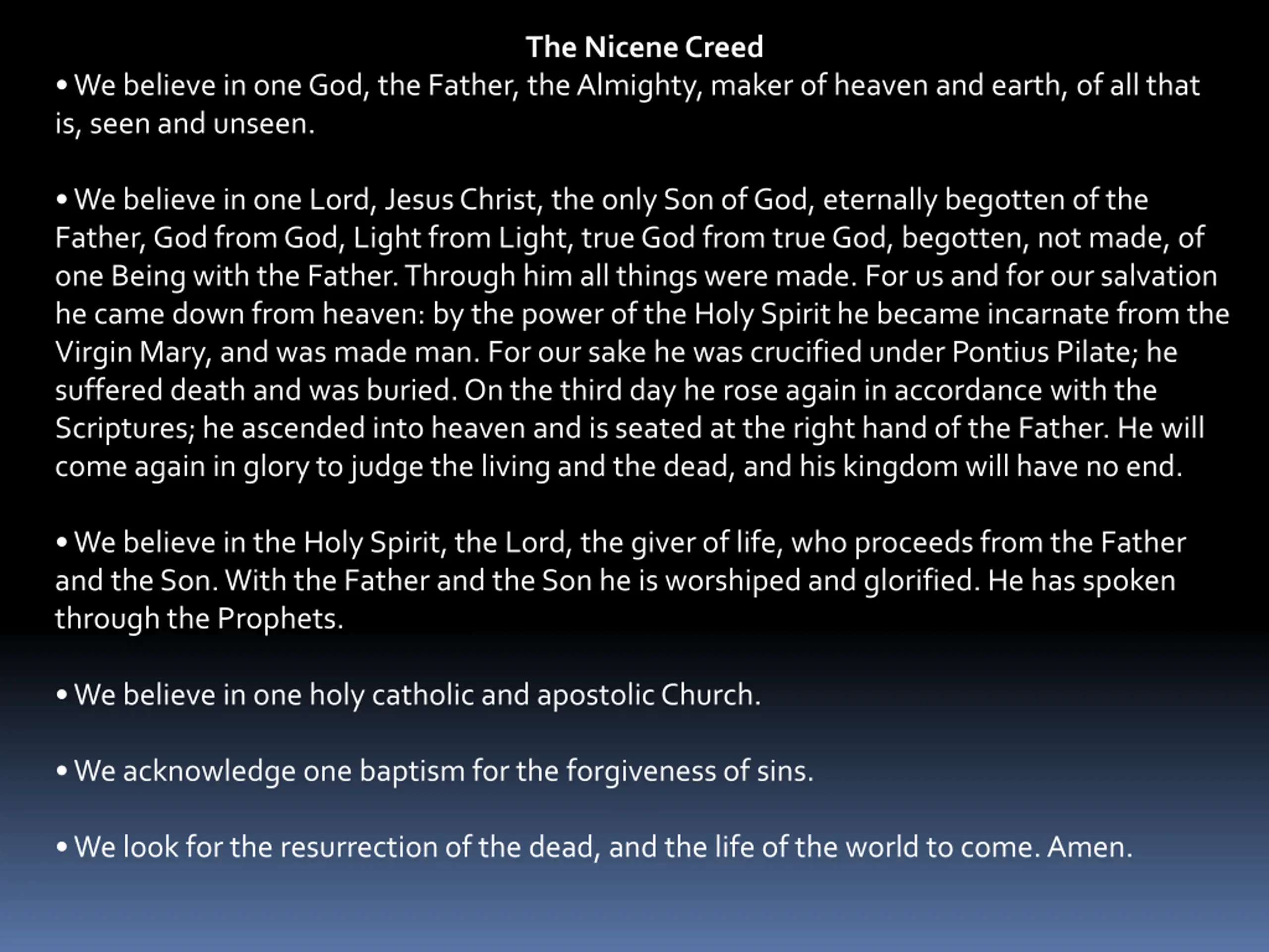 The Nicene Creed We believe in one God, the Father, the Almighty, maker of heaven and earth, of all that is, seen and unseen. We believe in one Lord, Jesus Christ, the only Son of God, eternally begotten of the Father, God from God, Light from Light, true God from true God, begotten, not made, of one Being with the Father. Through him all things were made. For us and for our salvation he came down from heaven: by the power of the Holy Spirit he became incarnate from the Virgin Mary, and was made man. For our sake he was crucified under Pontius Pilate; he suffered death and was buried. On the third day he rose again in accordance with the Scriptures; he ascended into heaven and is seated at the right hand of the Father. He will come again in glory to judge the living and the dead, and his kingdom will have no end. We believe in the Holy Spirit, the Lord, the giver of life, who proceeds from the Father and the Son. With the Father and the Son he is worshiped and glorified. He has spoken through the Prophets. We believe in one holy catholic and apostolic Church. We acknowledge one baptism for the forgiveness of sins. We look for the resurrection of the dead, and the life of the world to come. Amen.