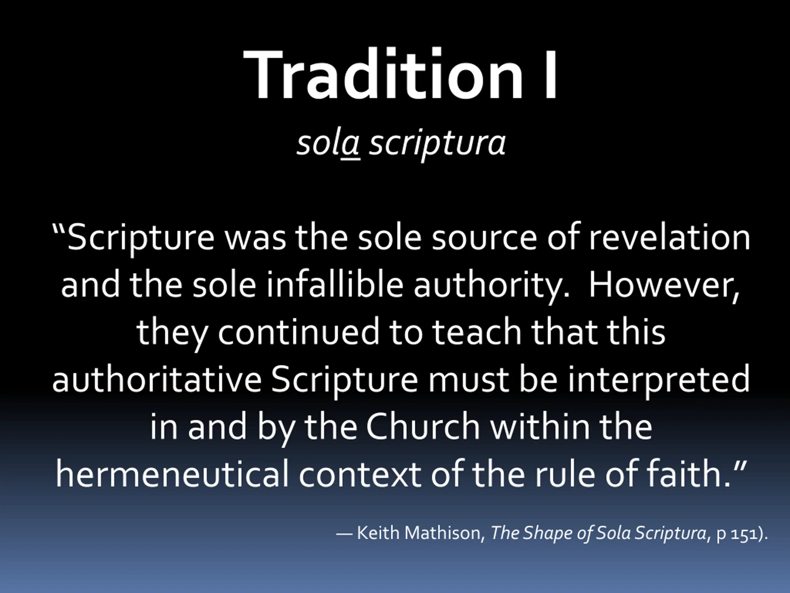 Tradition I sola scriptura Scripture was the sole source of revelation and the sole infallible authority. However, they continued to teach that this authoritative Scripture must be interpreted in and by the Church within the hermeneutical context of the rule of faith. Keith Mathison, The Shape of Sola Scriptura, p 151).
