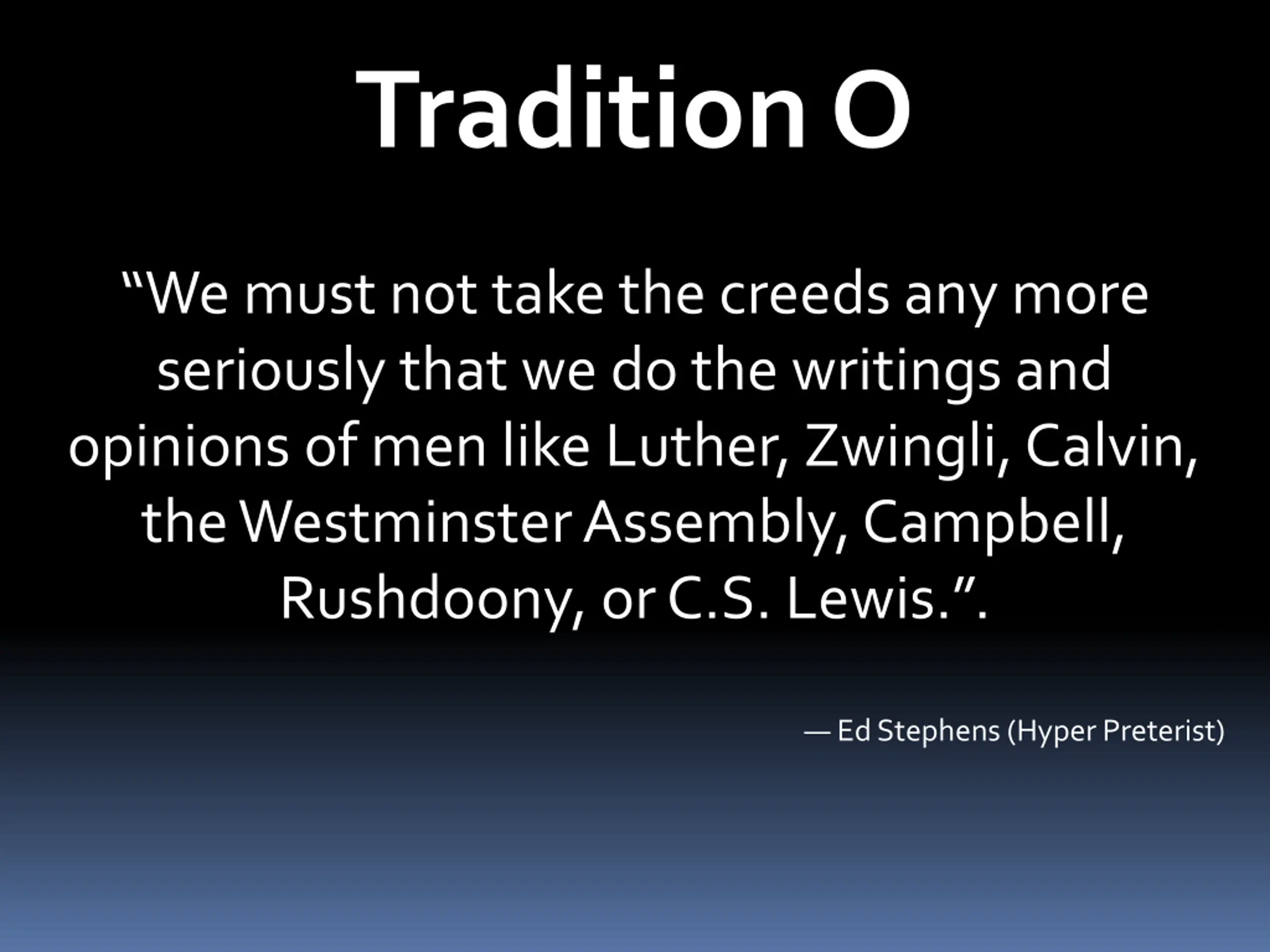 Tradition O We must not take the creeds any more seriously that we do the writings and opinions of men like Luther, Zwingli, Calvin, the Westminster Assembly, Campbell, Rushdoony, or C.S. Lewis. . Ed Stephens (Hyper Preterist)