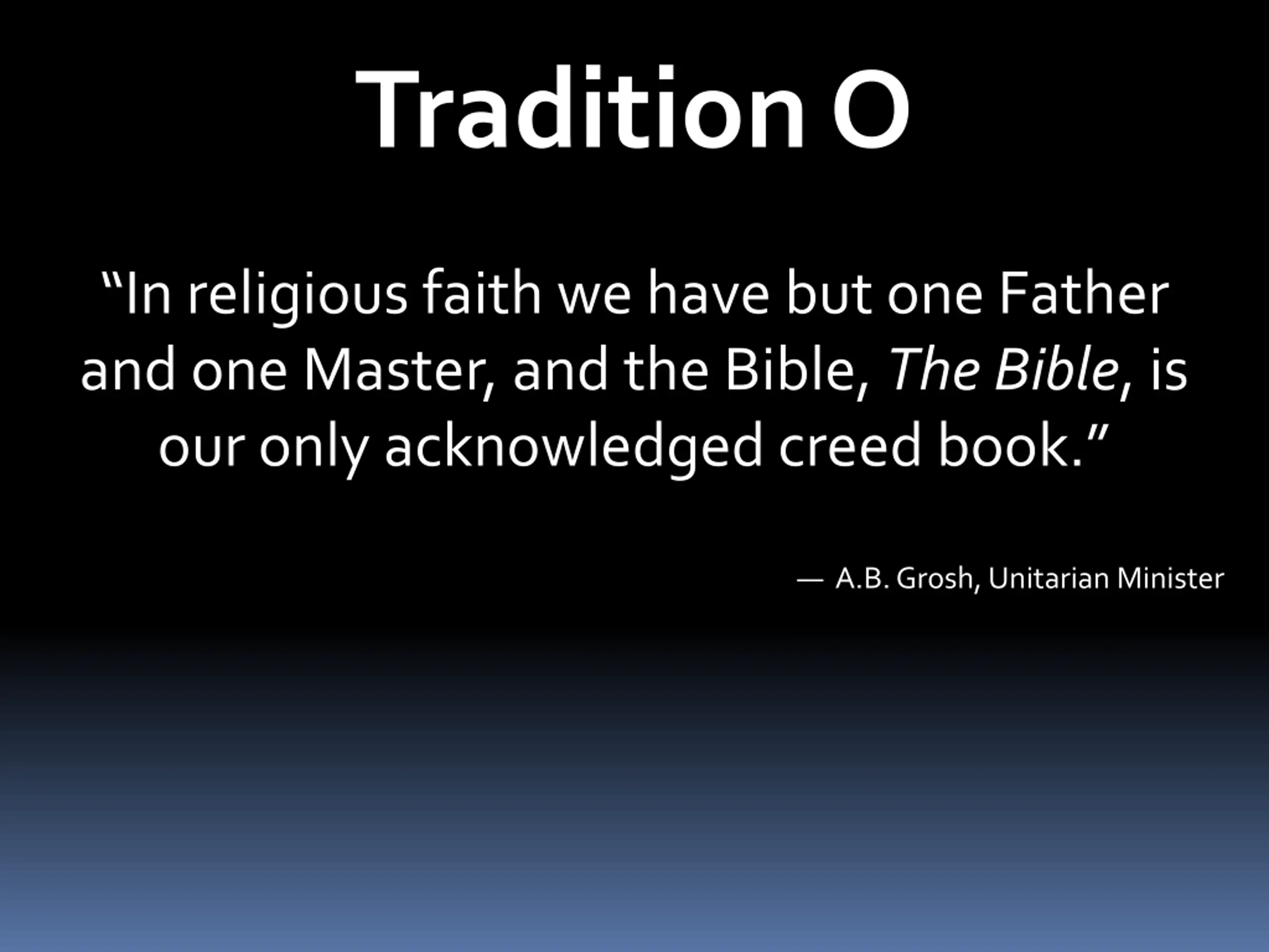 Tradition O In religious faith we have but one Father and one Master, and the Bible, The Bible, is our only acknowledged creed book. A.B. Grosh, Unitarian Minister