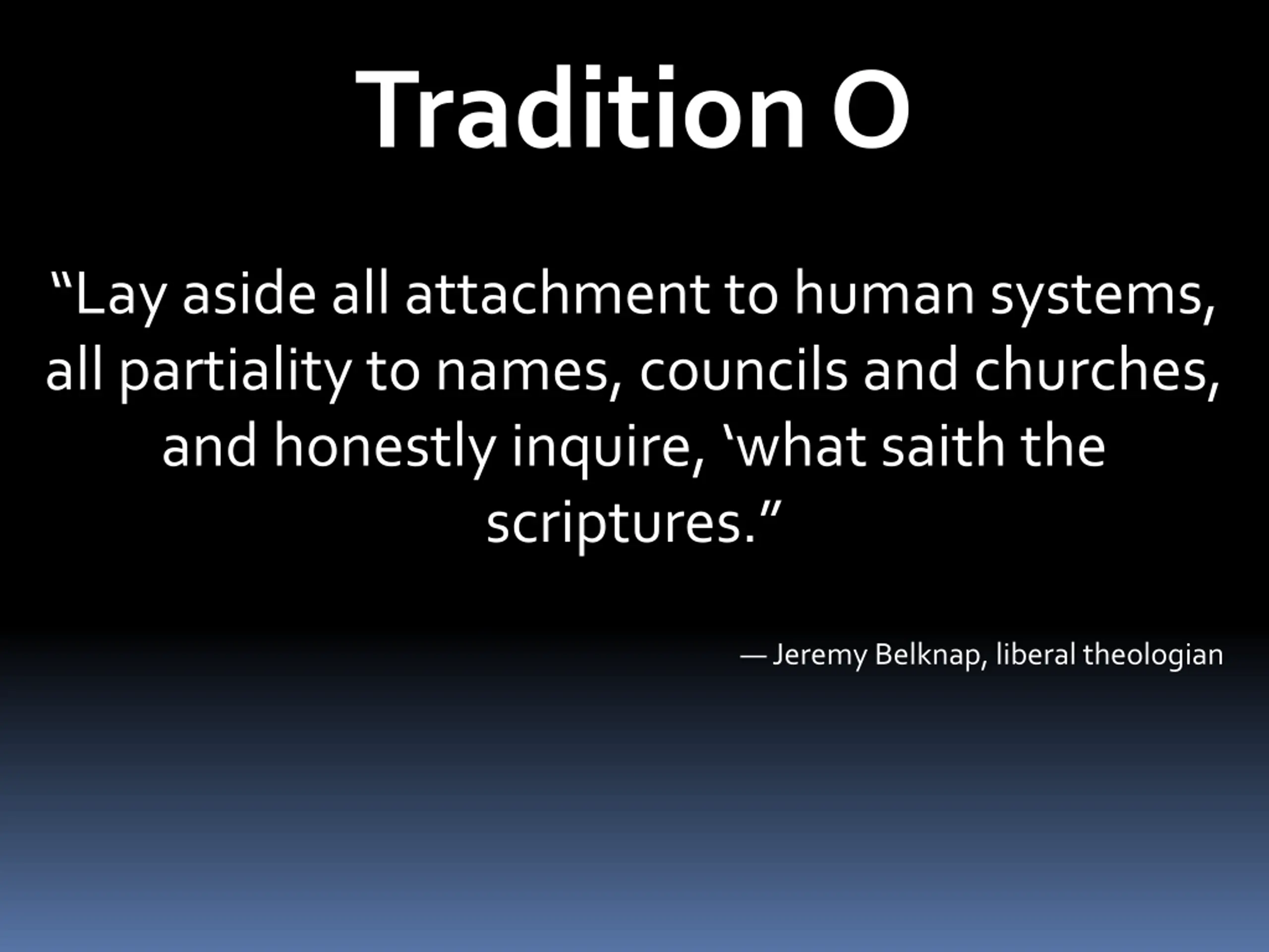 Tradition O Lay aside all attachment to human systems, all partiality to names, councils and churches, and honestly inquire, what saith the scriptures. Jeremy Belknap, liberal theologian