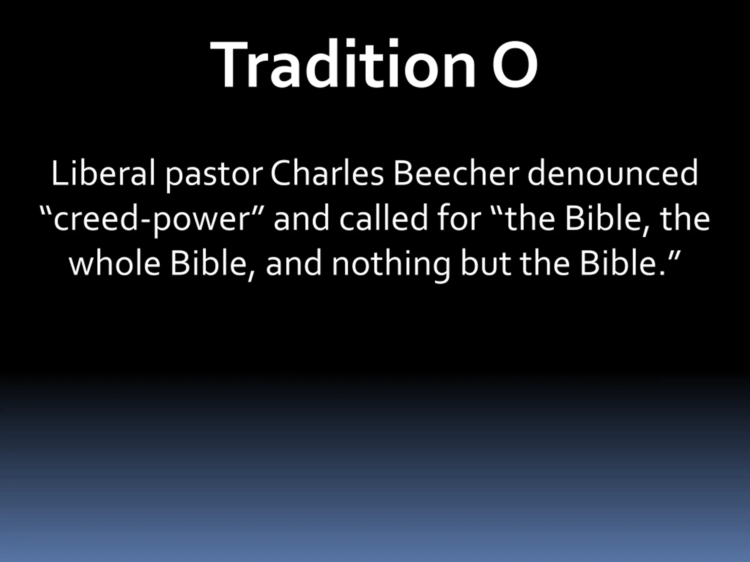 Tradition O Liberal pastor Charles Beecher denounced creed-power and called for the Bible, the whole Bible, and nothing but the Bible.