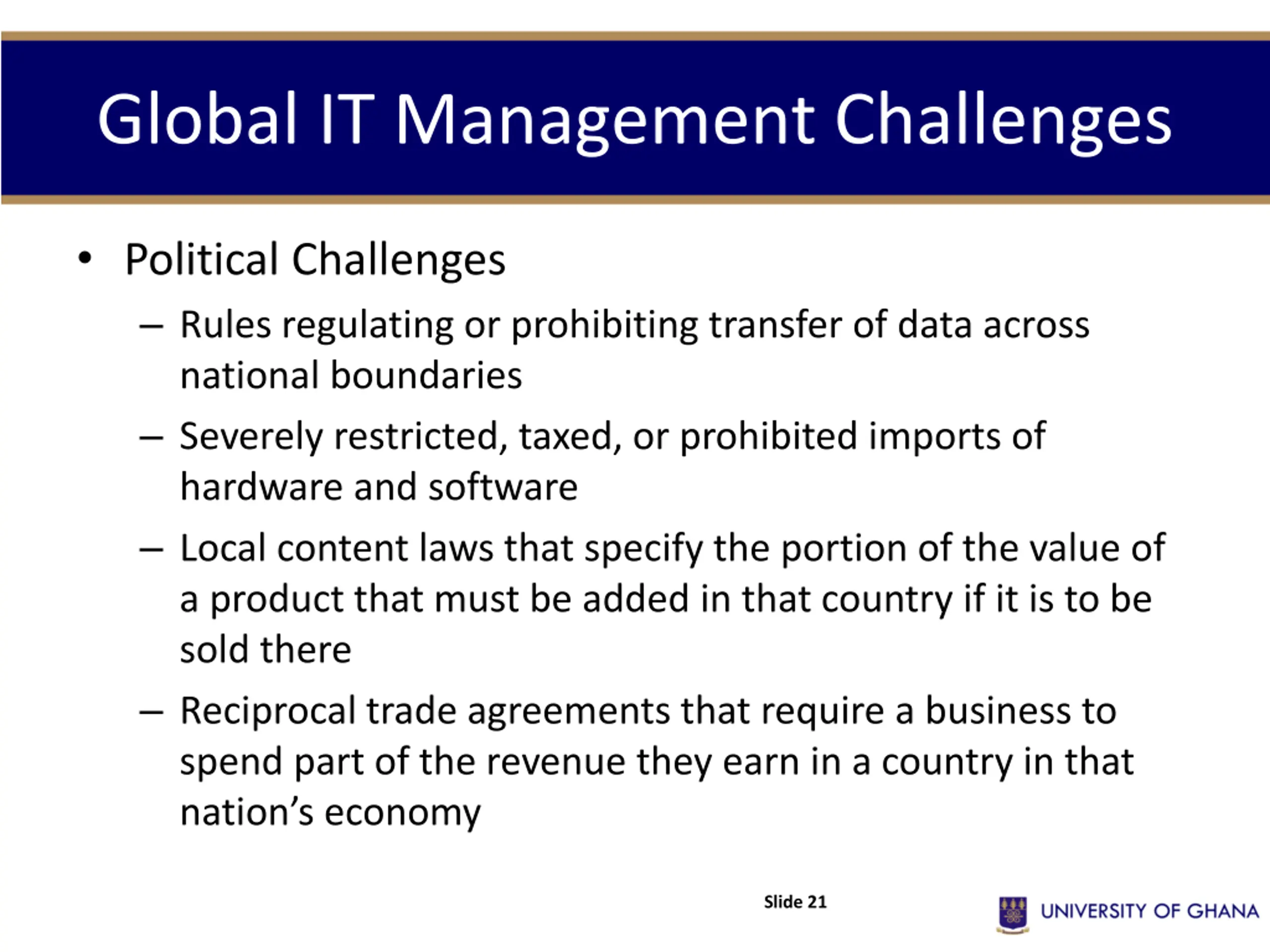 Global IT Management Challenges Political Challenges Rules regulating or prohibiting transfer of data across national boundaries Severely restricted, taxed, or prohibited imports of hardware and software Local content laws that specify the portion of the value of a product that must be added in that country if it is to be sold there Reciprocal trade agreements that require a business to spend part of the revenue they earn in a country in that nation s economy Slide 21