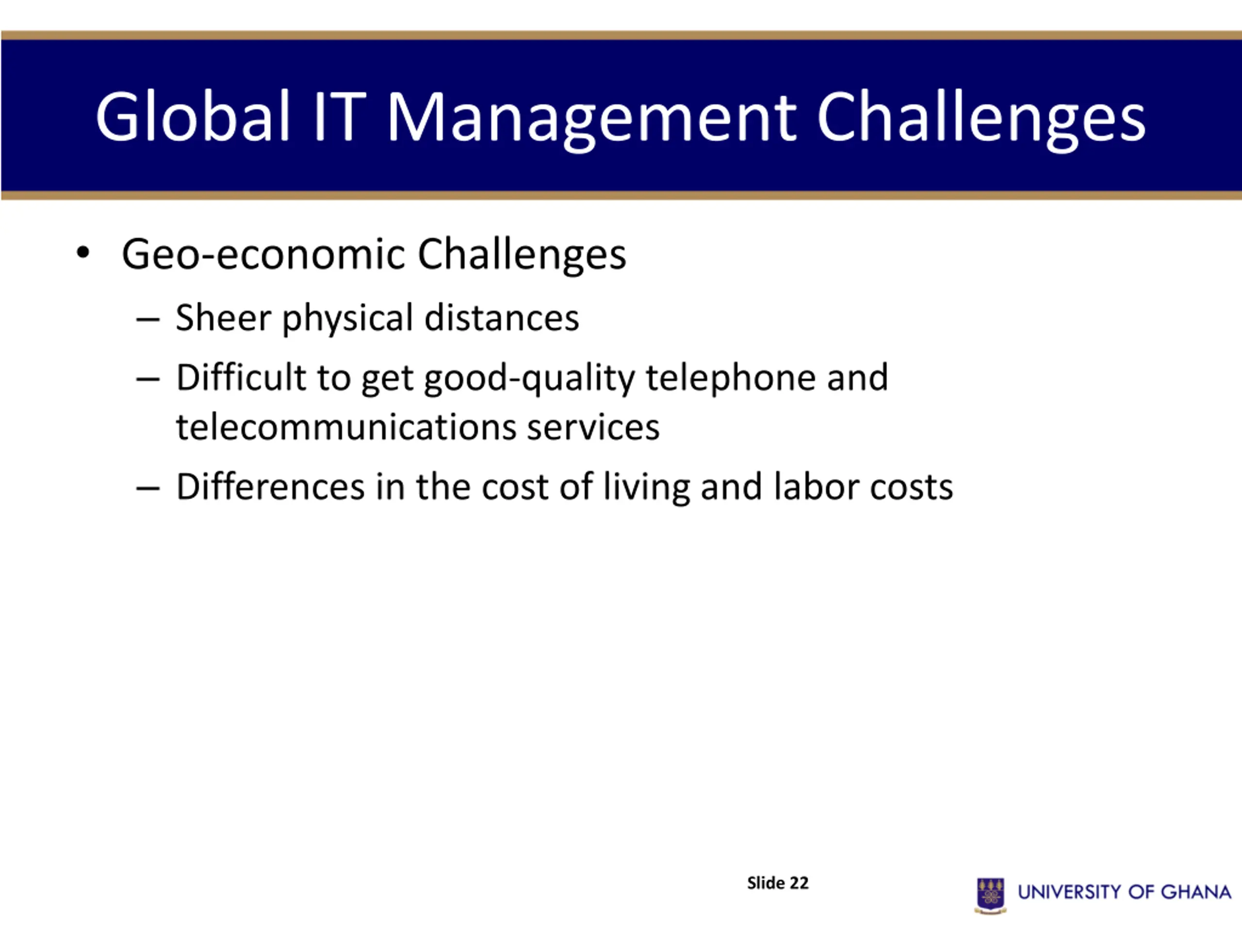 Global IT Management Challenges Geo-economic Challenges Sheer physical distances Difficult to get good-quality telephone and telecommunications services Differences in the cost of living and labor costs Slide 22