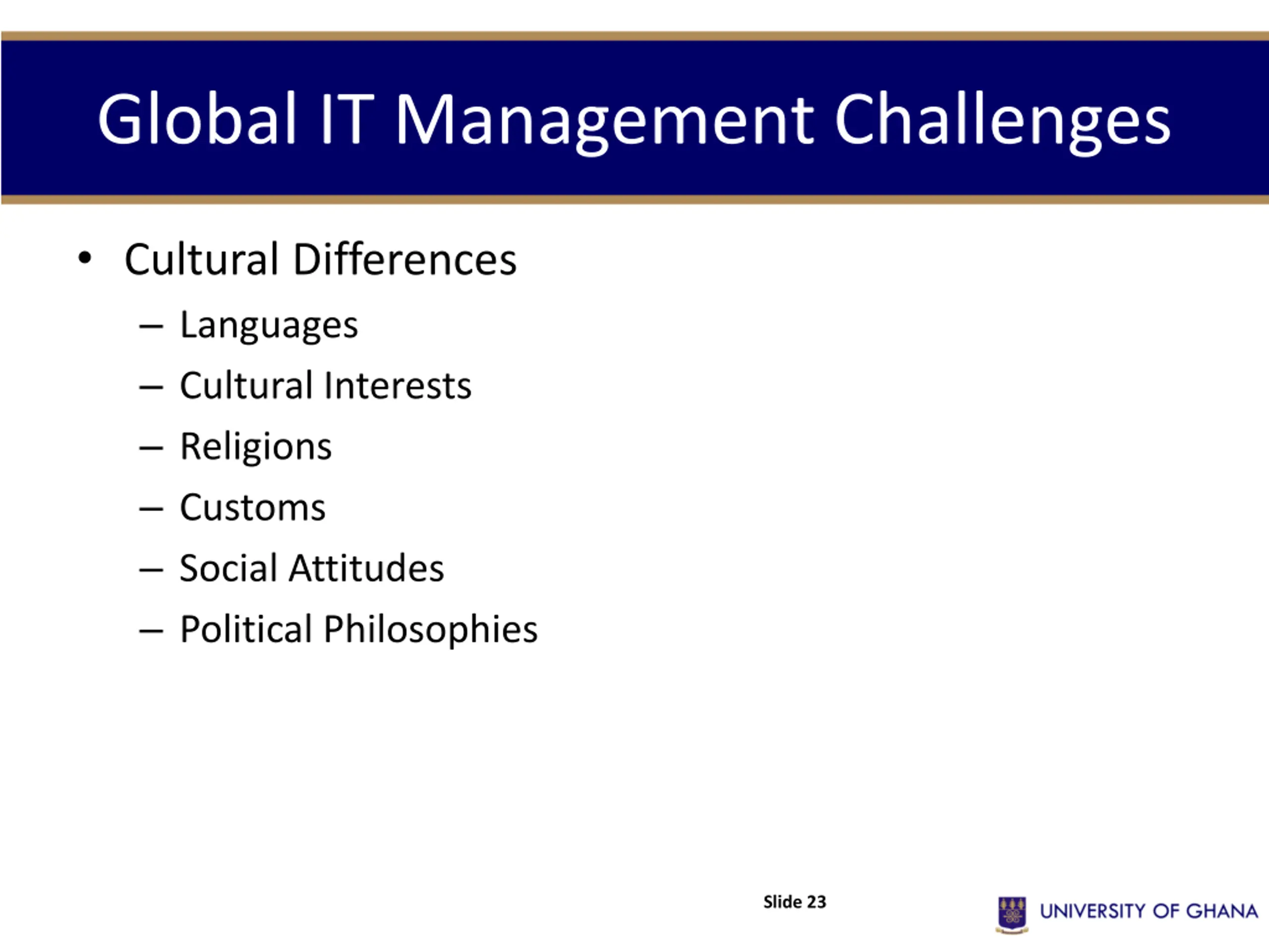 Global IT Management Challenges Cultural Differences Languages Cultural Interests Religions Customs Social Attitudes Political Philosophies Slide 23