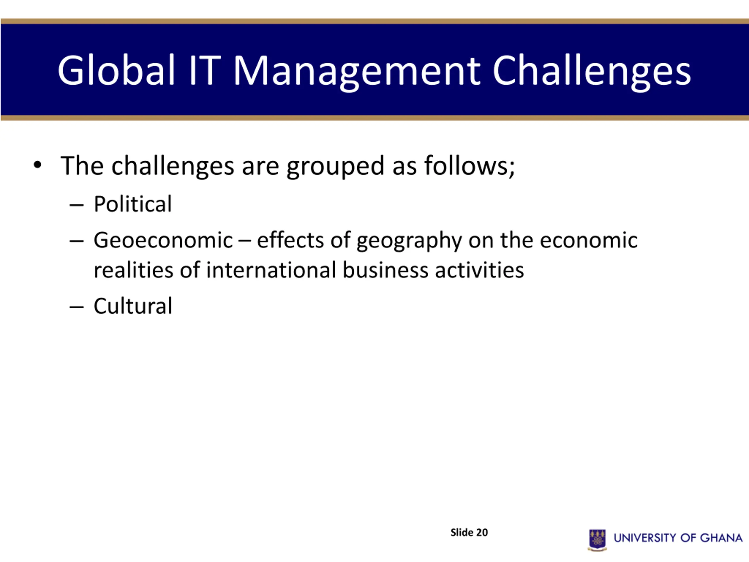 Global IT Management Challenges The challenges are grouped as follows; Political Geoeconomic effects of geography on the economic realities of international business activities Cultural Slide 20