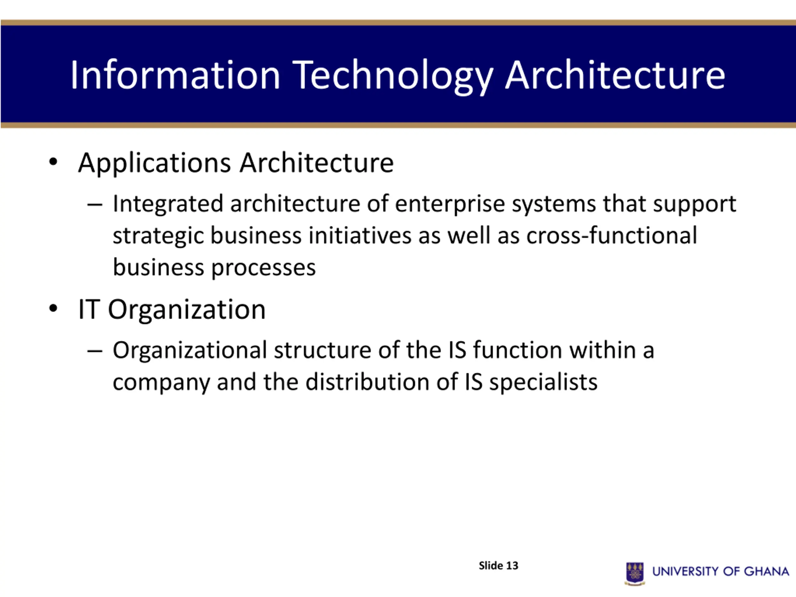 Information Technology Architecture Applications Architecture Integrated architecture of enterprise systems that support strategic business initiatives as well as cross-functional business processes IT Organization Organizational structure of the IS function within a company and the distribution of IS specialists Slide 13