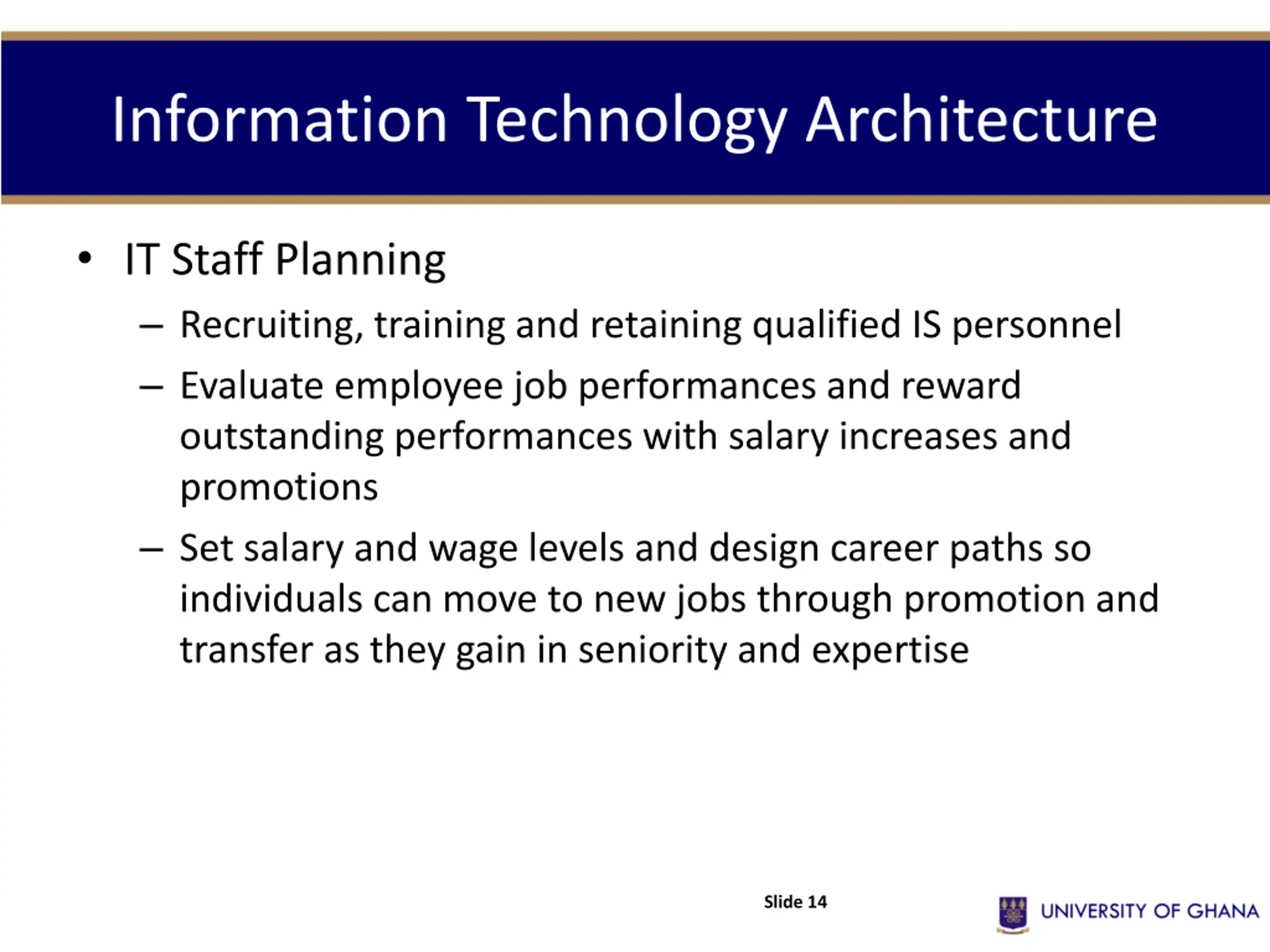 Information Technology Architecture IT Staff Planning Recruiting, training and retaining qualified IS personnel Evaluate employee job performances and reward outstanding performances with salary increases and promotions Set salary and wage levels and design career paths so individuals can move to new jobs through promotion and transfer as they gain in seniority and expertise Slide 14