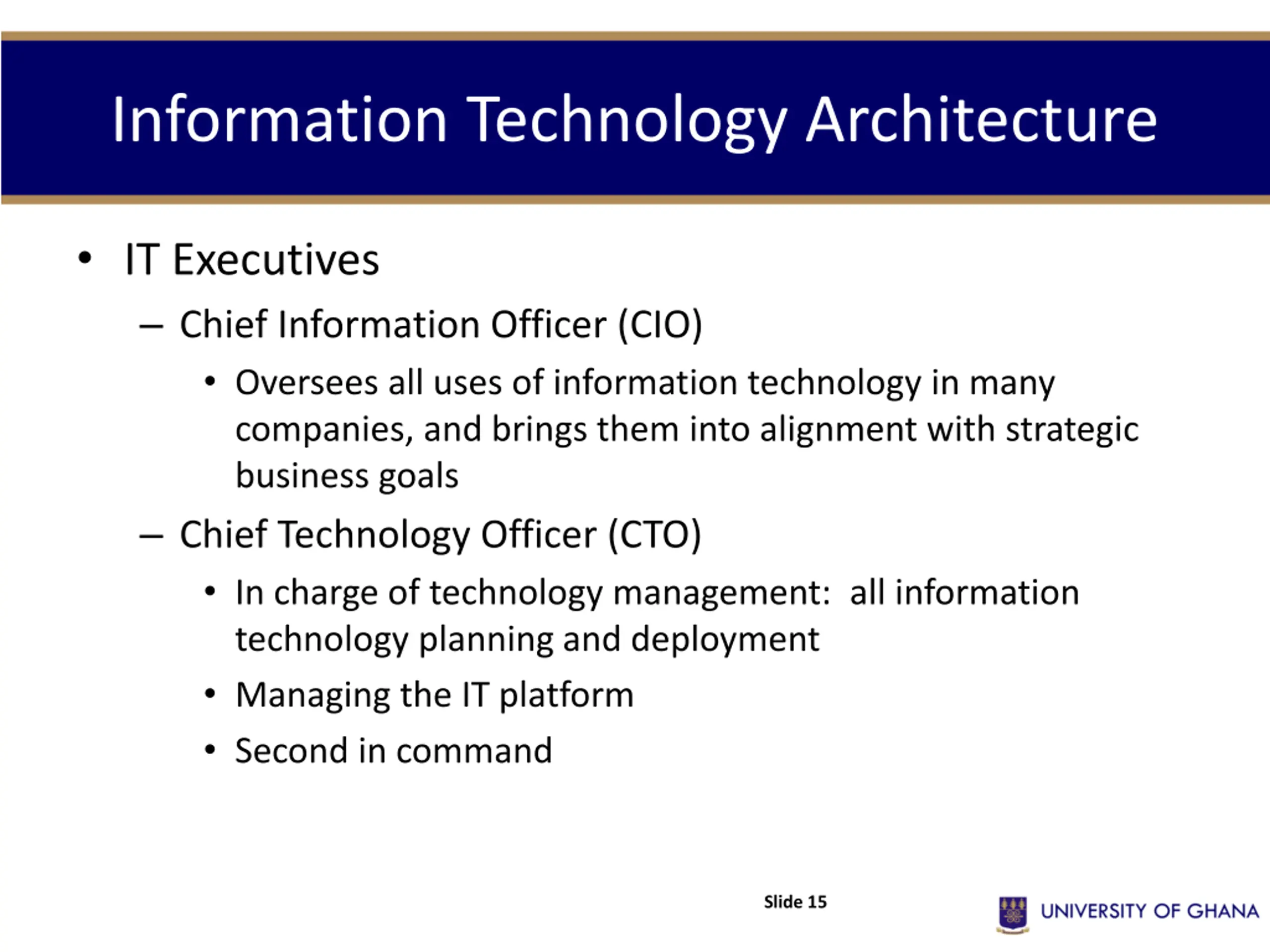 Information Technology Architecture IT Executives Chief Information Officer (CIO) Oversees all uses of information technology in many companies, and brings them into alignment with strategic business goals Chief Technology Officer (CTO) In charge of technology management: all information technology planning and deployment Managing the IT platform Second in command Slide 15