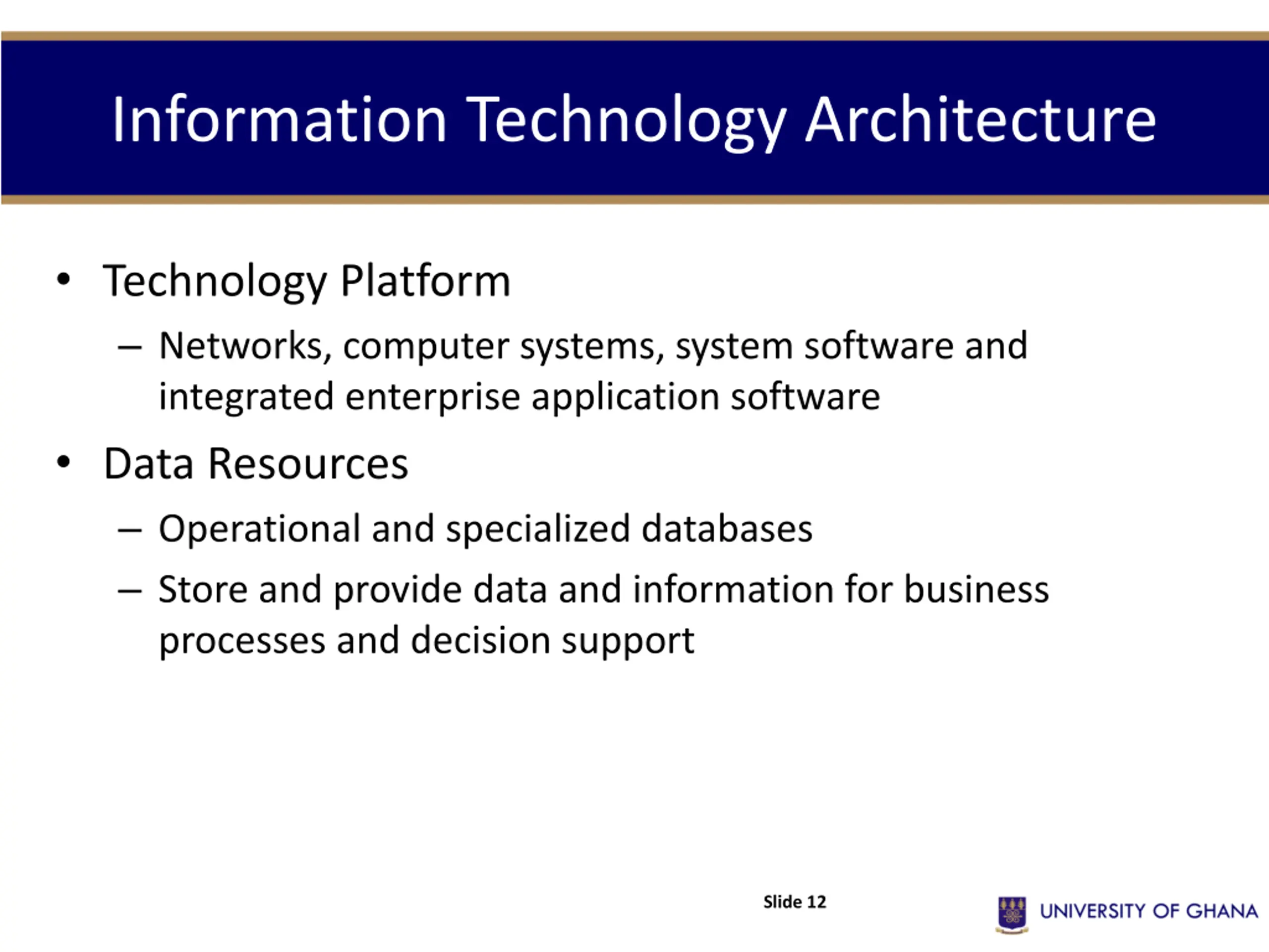 Information Technology Architecture Technology Platform Networks, computer systems, system software and integrated enterprise application software Data Resources Operational and specialized databases Store and provide data and information for business processes and decision support Slide 12
