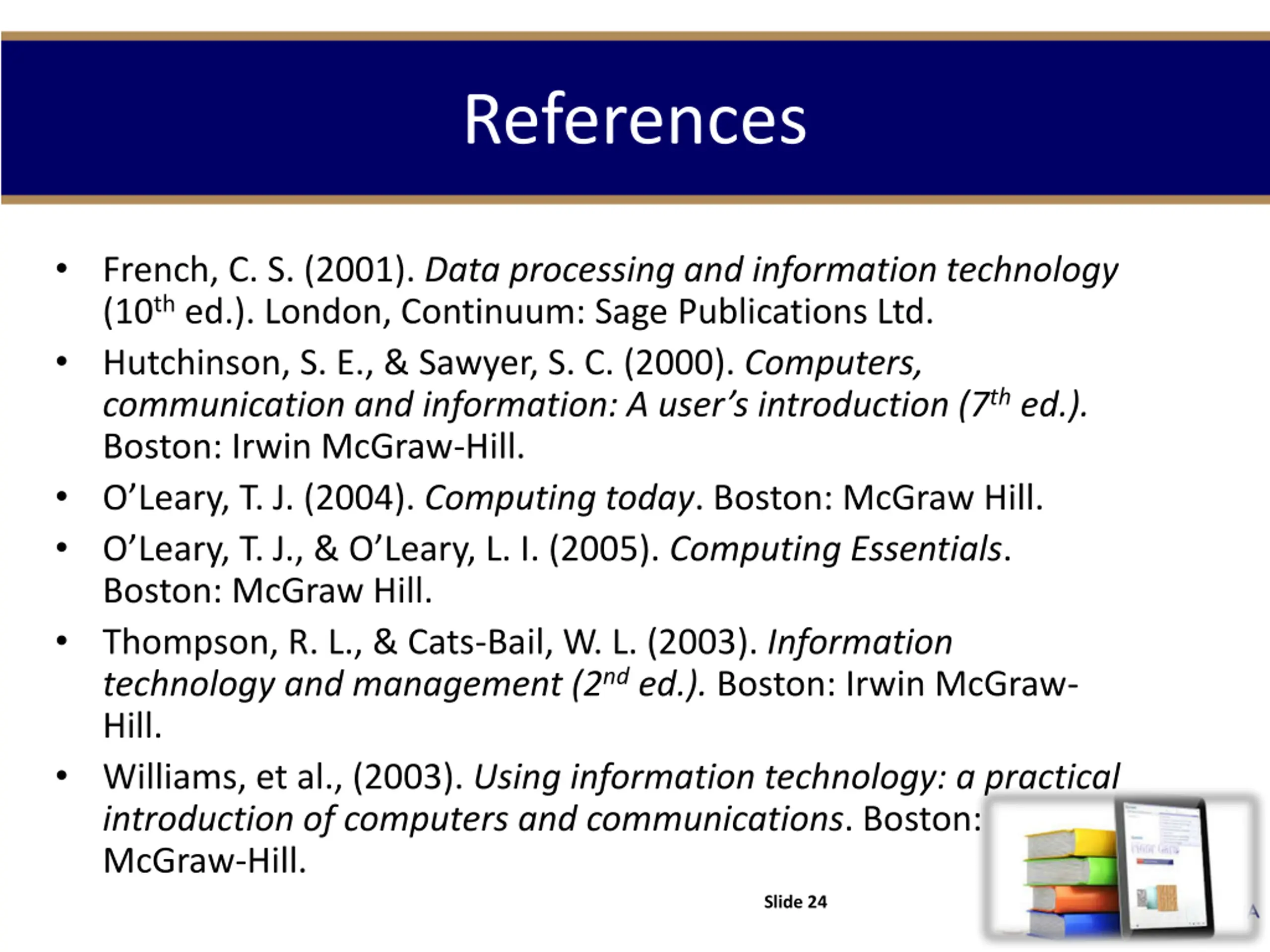 References French, C. S. (2001). Data processing and information technology (10th ed.). London, Continuum: Sage Publications Ltd. Hutchinson, S. E., & Sawyer, S. C. (2000). Computers, communication and information: A user s introduction (7th ed.). Boston: Irwin McGraw-Hill. O Leary, T. J. (2004). Computing today. Boston: McGraw Hill. O Leary, T. J., & O Leary, L. I. (2005). Computing Essentials. Boston: McGraw Hill. Thompson, R. L., & Cats-Bail, W. L. (2003). Information technology and management (2nd ed.). Boston: Irwin McGraw- Hill. Williams, et al., (2003). Using information technology: a practical introduction of computers and communications. Boston: McGraw-Hill. Slide 24