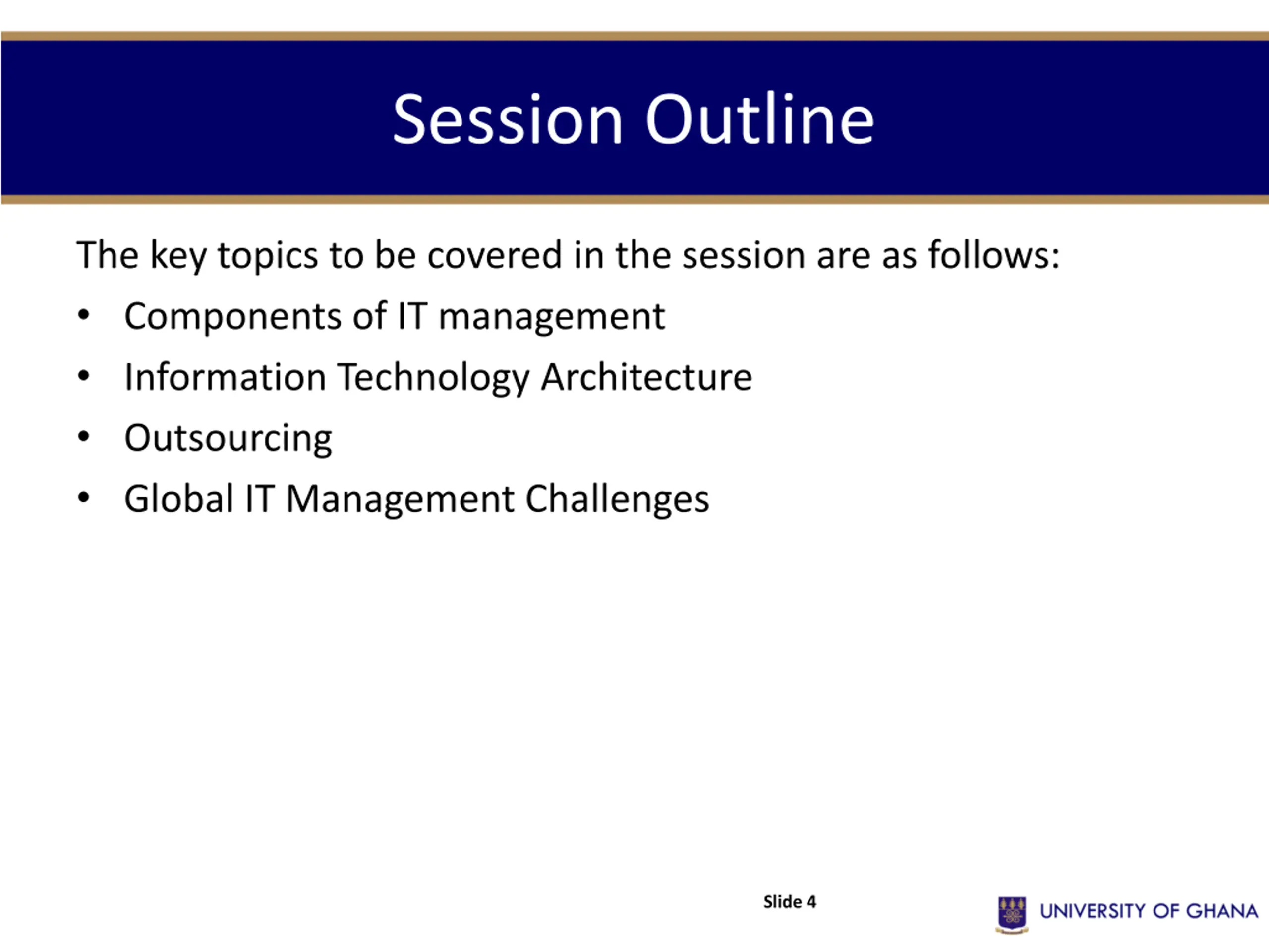 Session Outline The key topics to be covered in the session are as follows: Components of IT management Information Technology Architecture Outsourcing Global IT Management Challenges Slide 4