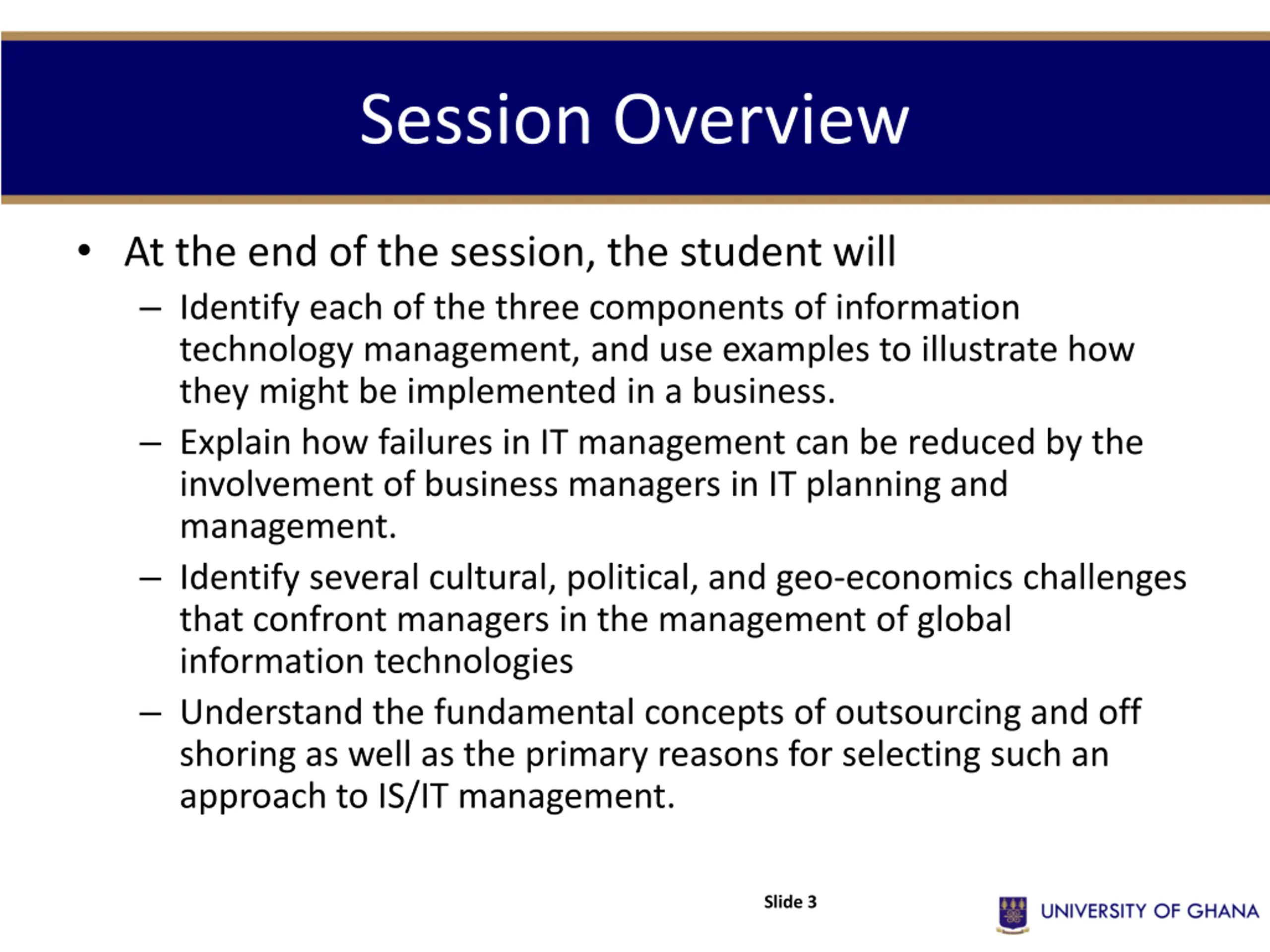 Session Overview At the end of the session, the student will Identify each of the three components of information technology management, and use examples to illustrate how they might be implemented in a business. Explain how failures in IT management can be reduced by the involvement of business managers in IT planning and management. Identify several cultural, political, and geo-economics challenges that confront managers in the management of global information technologies Understand the fundamental concepts of outsourcing and off shoring as well as the primary reasons for selecting such an approach to IS/IT management. Slide 3