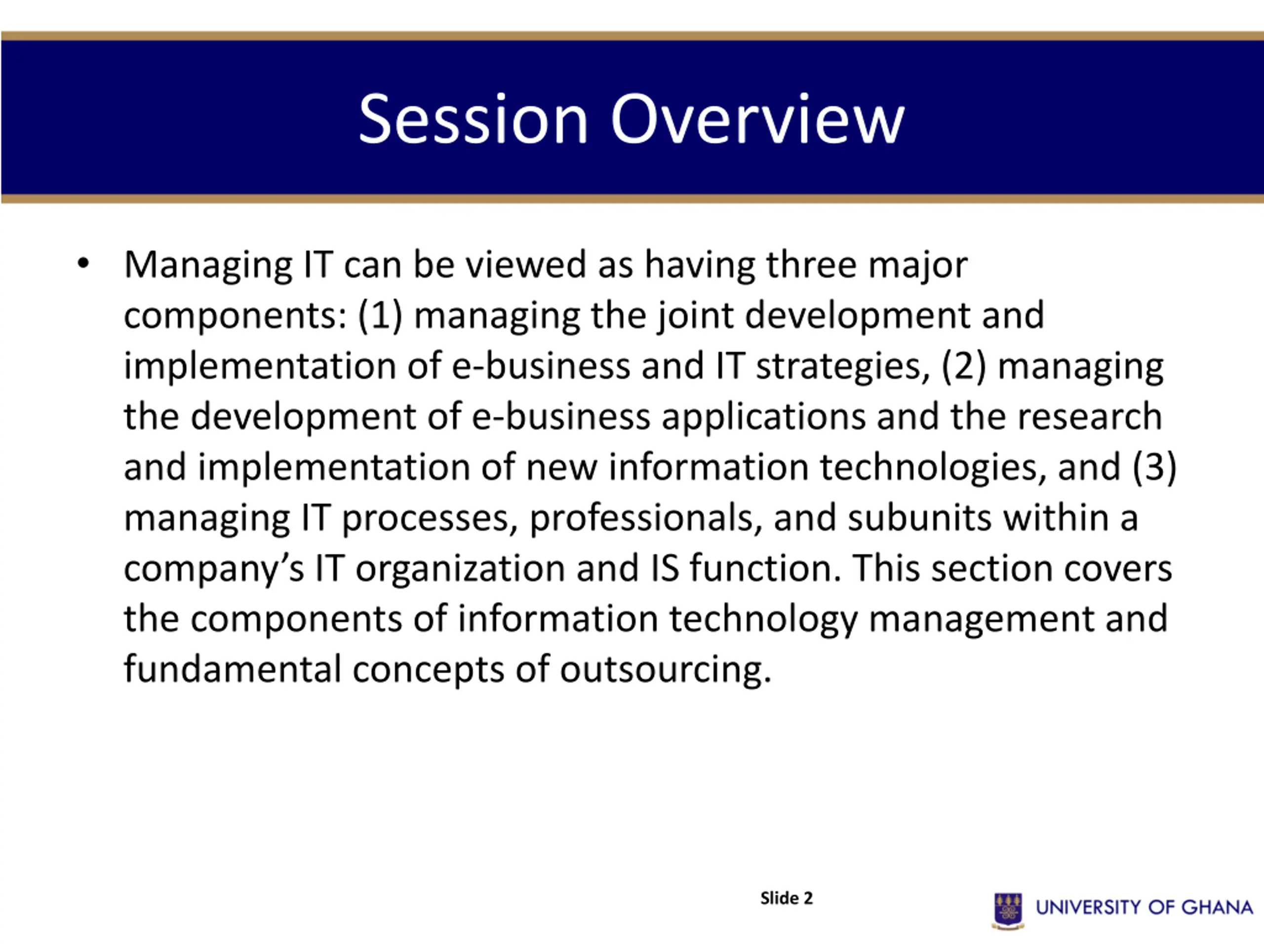 Session Overview Managing IT can be viewed as having three major components: (1) managing the joint development and implementation of e-business and IT strategies, (2) managing the development of e-business applications and the research and implementation of new information technologies, and (3) managing IT processes, professionals, and subunits within a company s IT organization and IS function. This section covers the components of information technology management and fundamental concepts of outsourcing. Slide 2