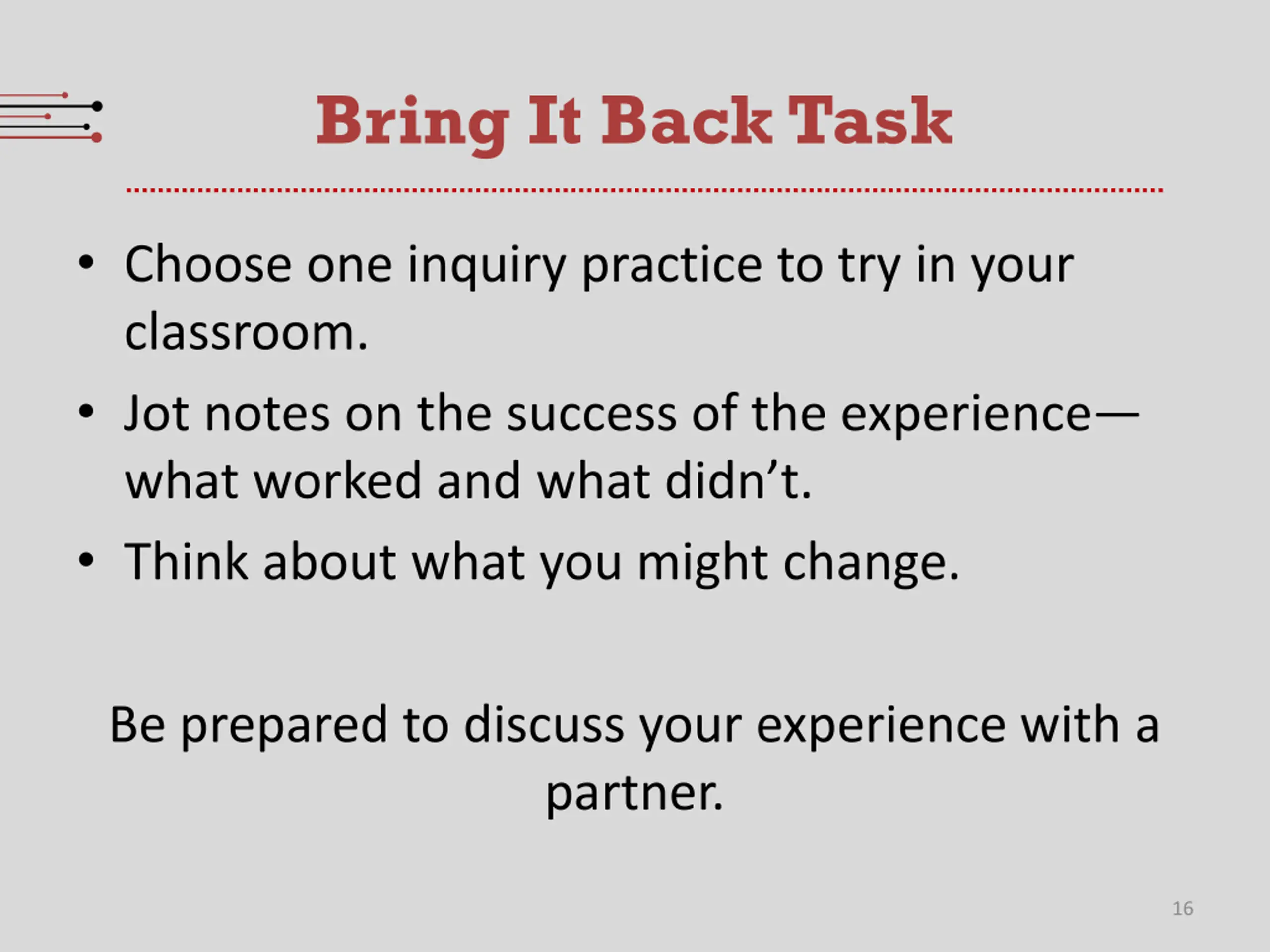 Bring It Back Task Choose one inquiry practice to try in your classroom. Jot notes on the success of the experience what worked and what didn t. Think about what you might change. Be prepared to discuss your experience with a partner. 16