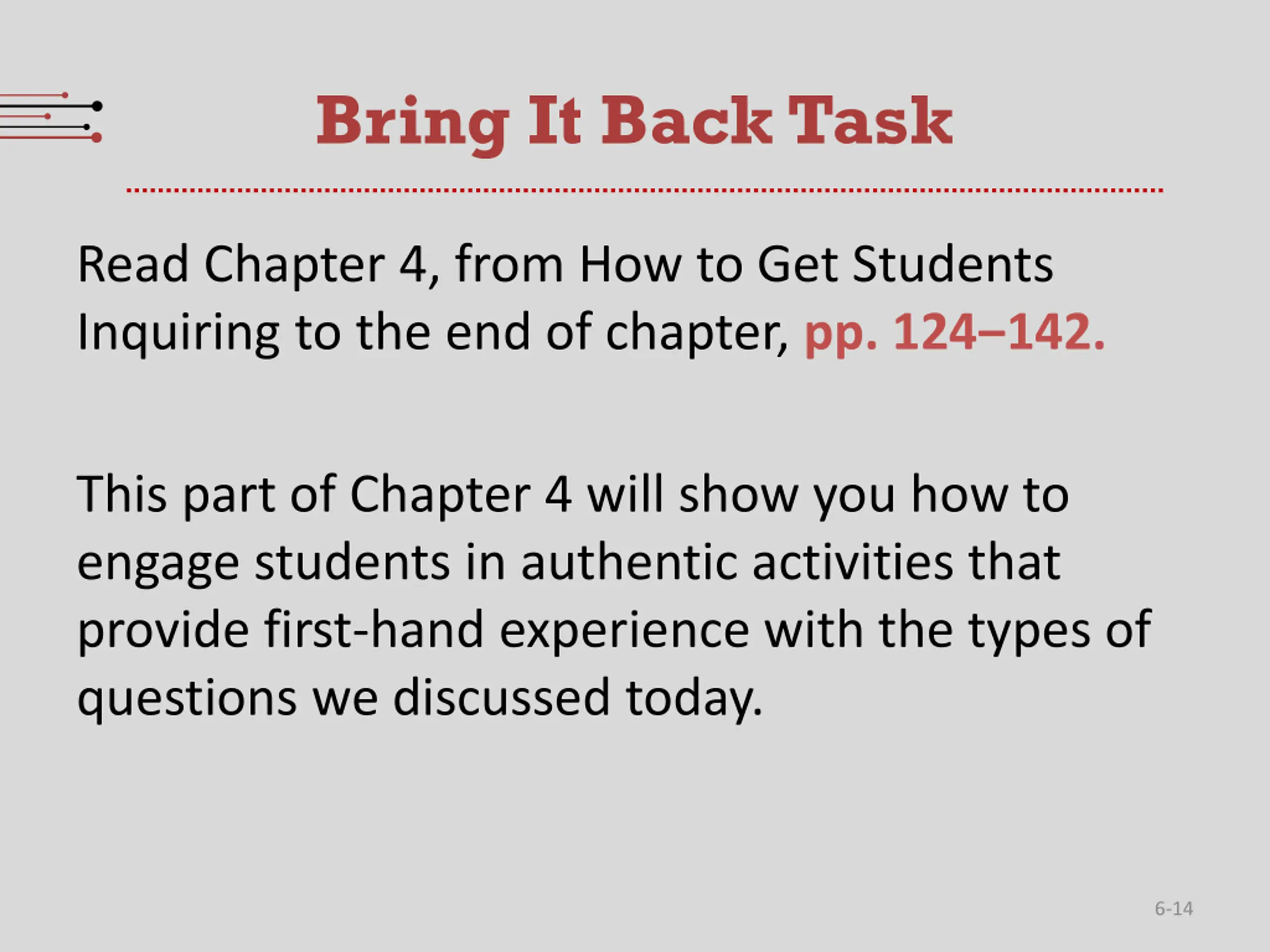 Bring It Back Task Read Chapter 4, from How to Get Students Inquiring to the end of chapter, pp. 124 142. This part of Chapter 4 will show you how to engage students in authentic activities that provide first-hand experience with the types of questions we discussed today. 6-14