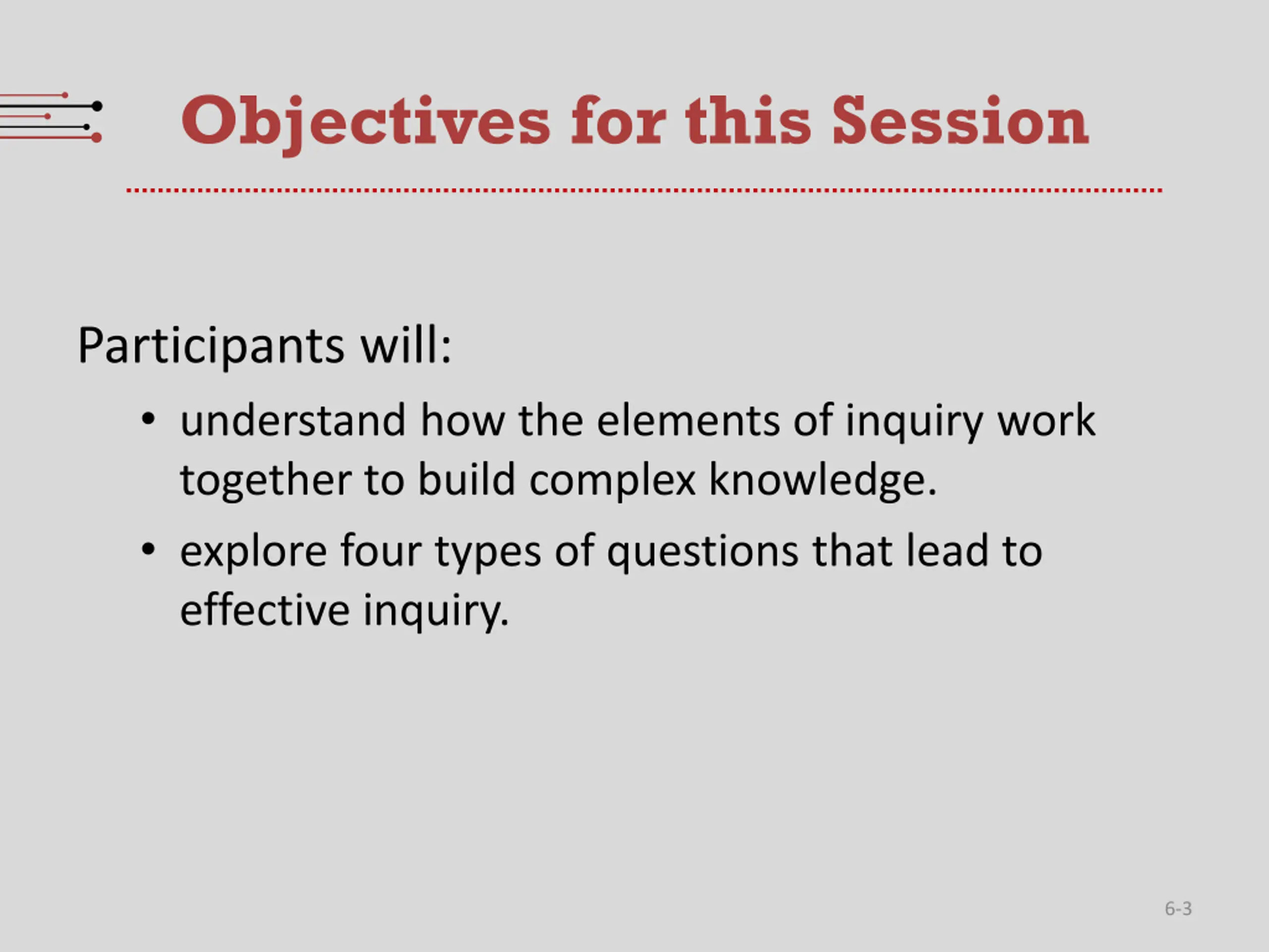 Objectives for this Session Participants will: understand how the elements of inquiry work together to build complex knowledge. explore four types of questions that lead to effective inquiry. 6-3