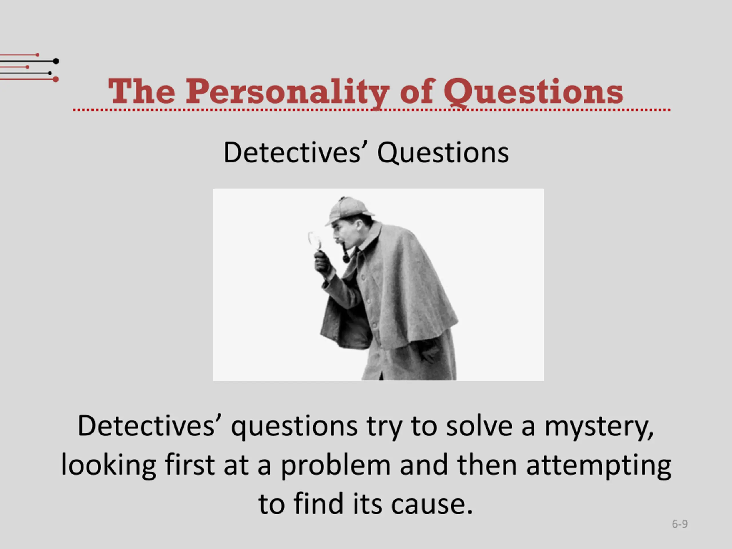 The Personality of Questions Detectives Questions Detectives questions try to solve a mystery, looking first at a problem and then attempting to find its cause. 6-9