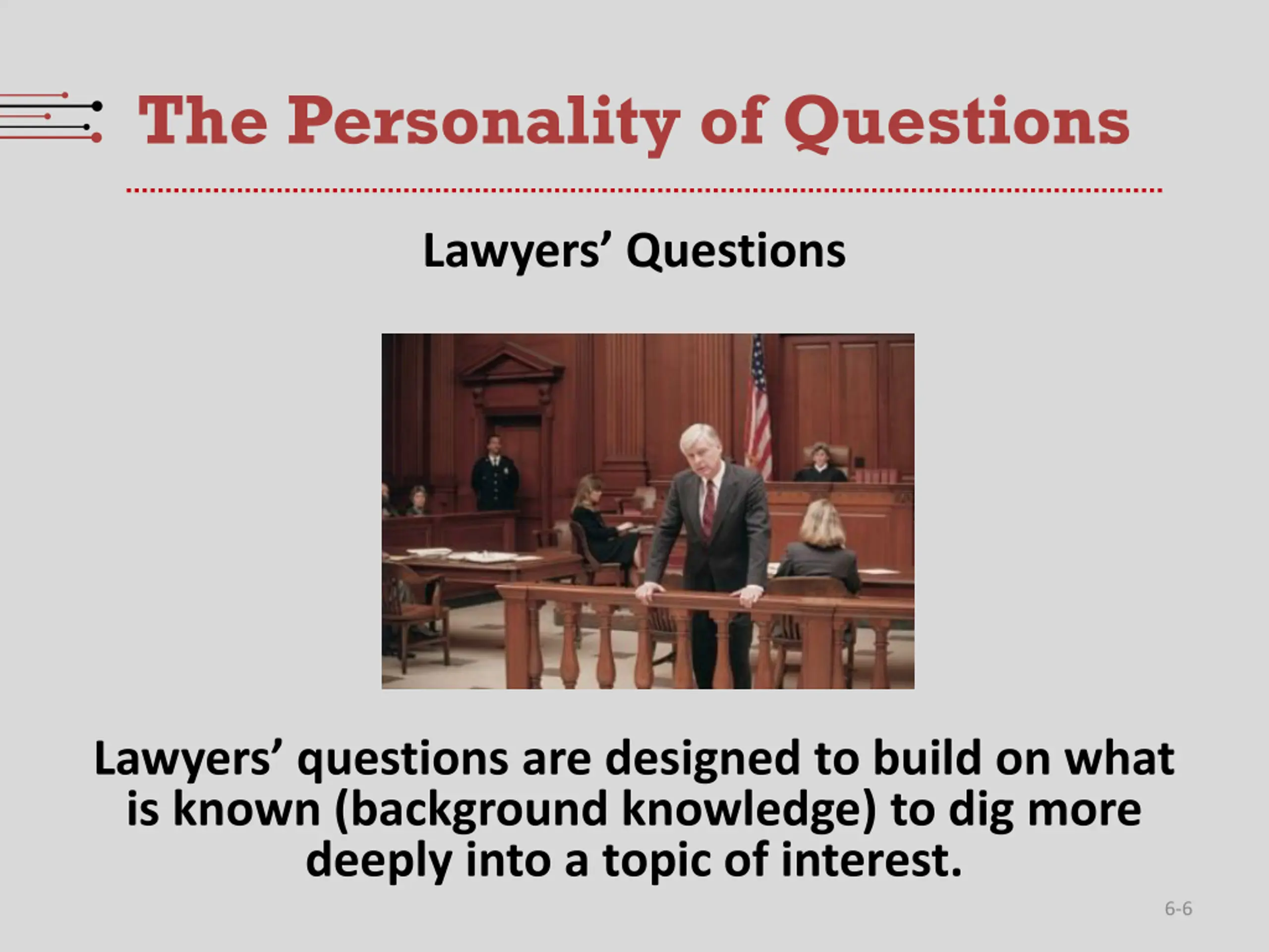 The Personality of Questions Lawyers Questions Lawyers questions are designed to build on what is known (background knowledge) to dig more deeply into a topic of interest. 6-6