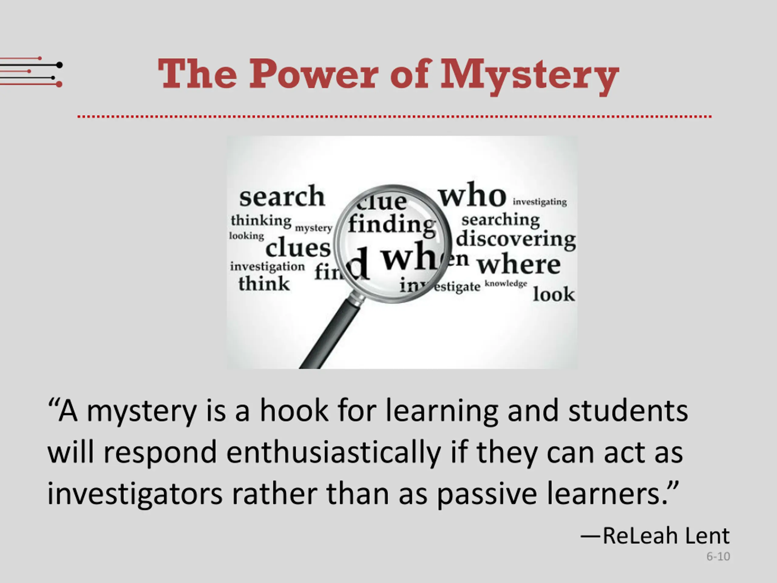 The Power of Mystery A mystery is a hook for learning and students will respond enthusiastically if they can act as investigators rather than as passive learners. ReLeah Lent 6-10