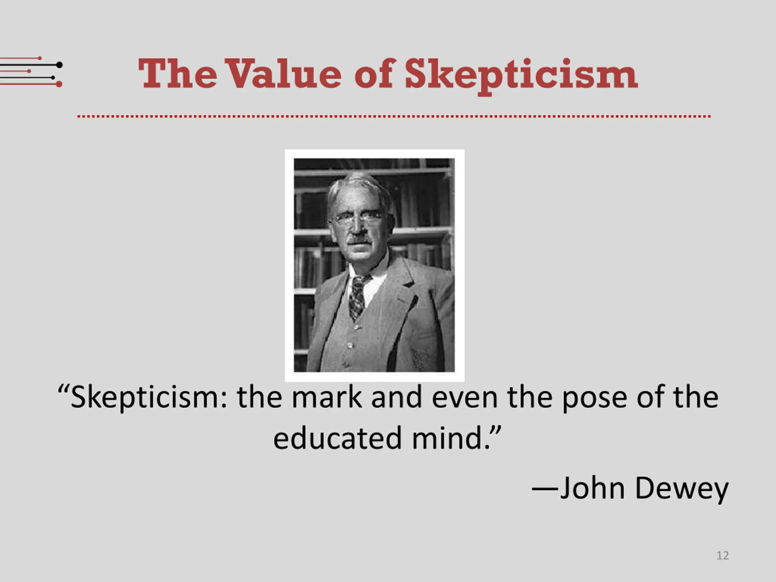 The Value of Skepticism Skepticism: the mark and even the pose of the educated mind. John Dewey 12
