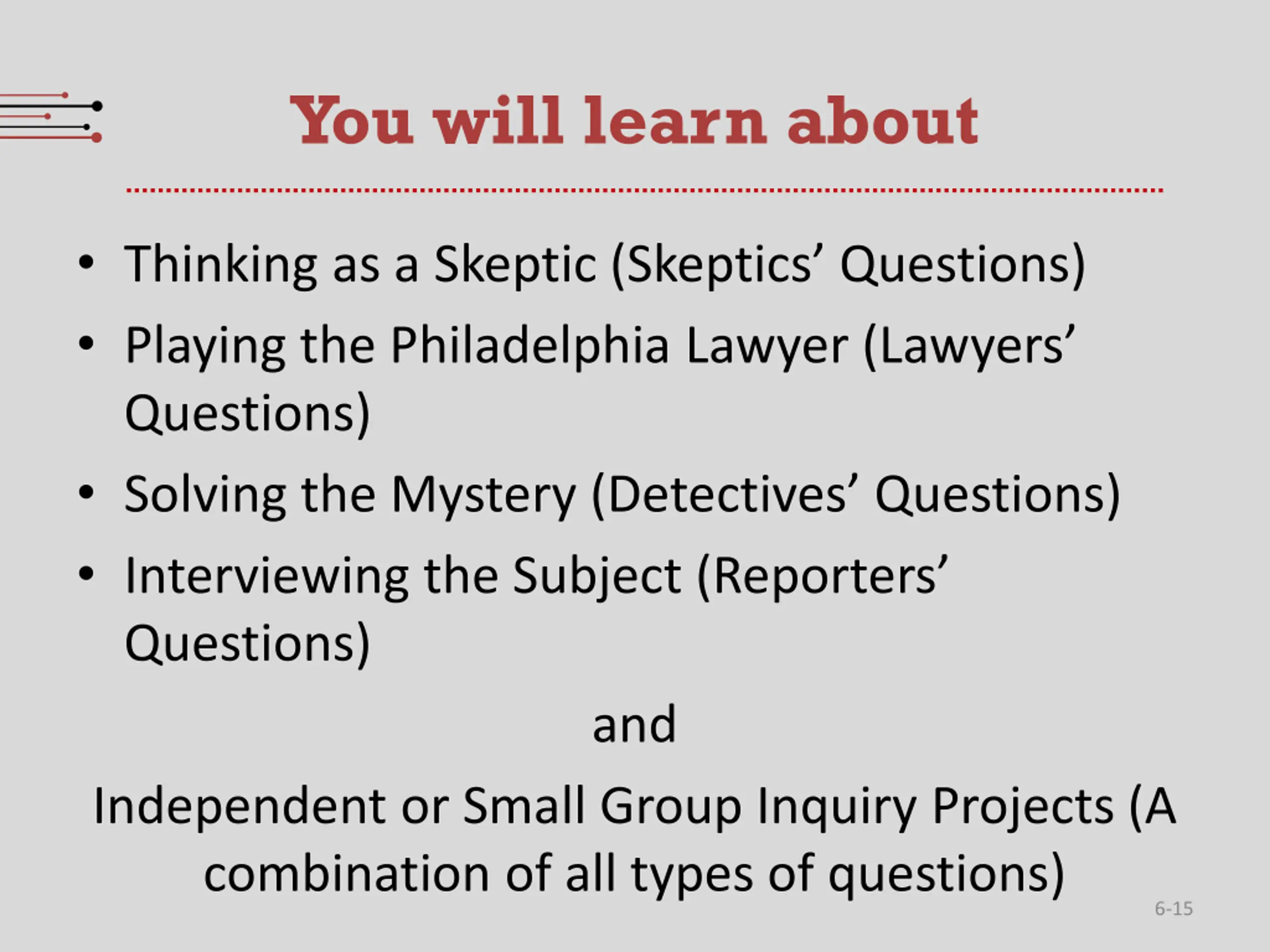 You will learn about Thinking as a Skeptic (Skeptics Questions) Playing the Philadelphia Lawyer (Lawyers Questions) Solving the Mystery (Detectives Questions) Interviewing the Subject (Reporters Questions) and Independent or Small Group Inquiry Projects (A combination of all types of questions) 6-15