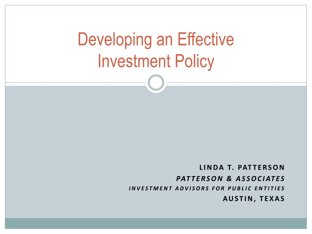 Developing an Effective Investment Policy LINDA T. PATTERSON PATTERSON & ASSOCIATES INVESTMENT ADVISORS FOR PUBLIC ENTITIES AUSTIN, TEXAS