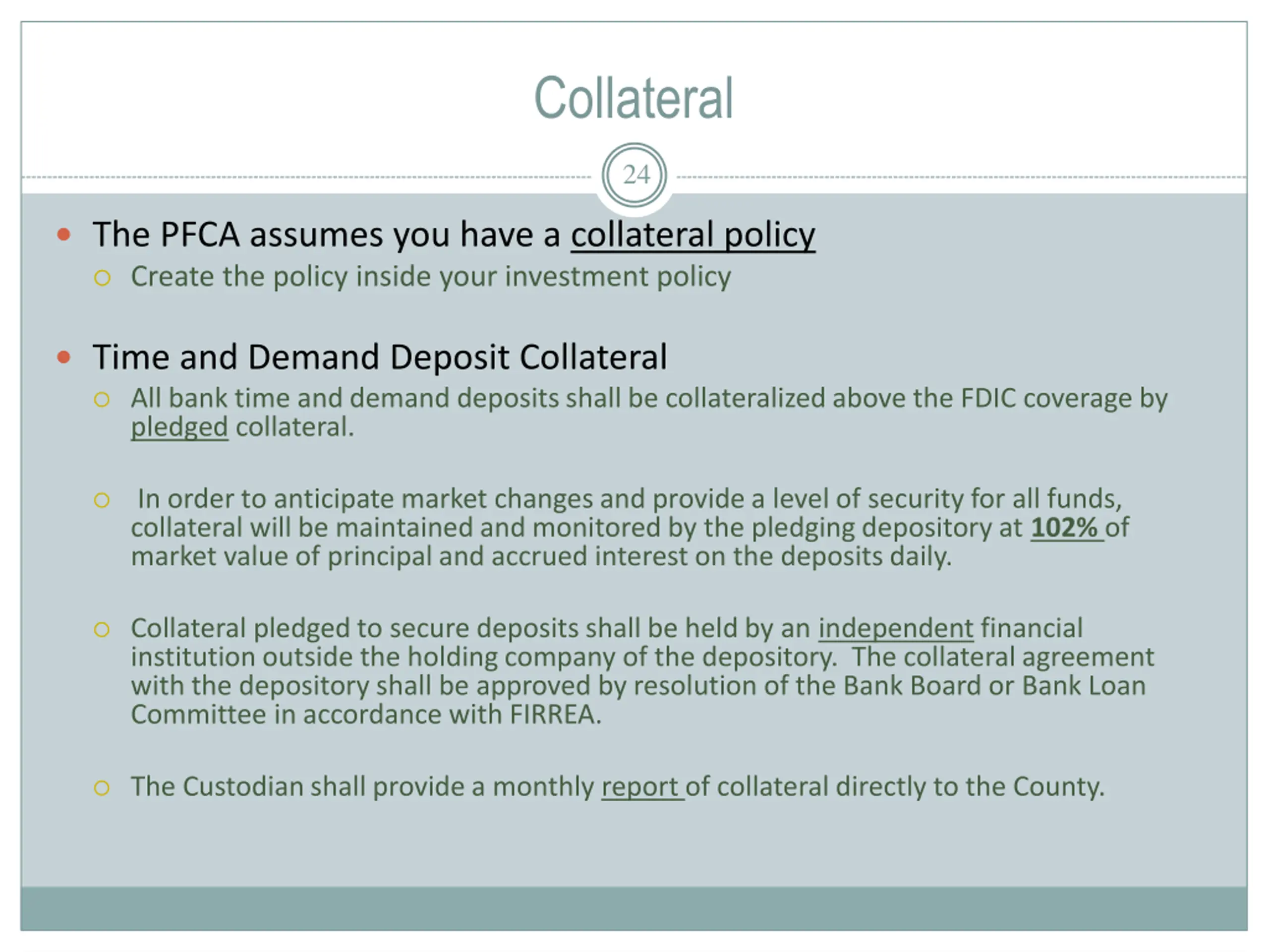 Collateral 24 The PFCA assumes you have a collateral policy Create the policy inside your investment policy Time and Demand Deposit Collateral All bank time and demand deposits shall be collateralized above the FDIC coverage by pledged collateral. In order to anticipate market changes and provide a level of security for all funds, collateral will be maintained and monitored by the pledging depository at 102% of market value of principal and accrued interest on the deposits daily. Collateral pledged to secure deposits shall be held by an independent financial institution outside the holding company of the depository. The collateral agreement with the depository shall be approved by resolution of the Bank Board or Bank Loan Committee in accordance with FIRREA. The Custodian shall provide a monthly report of collateral directly to the County.
