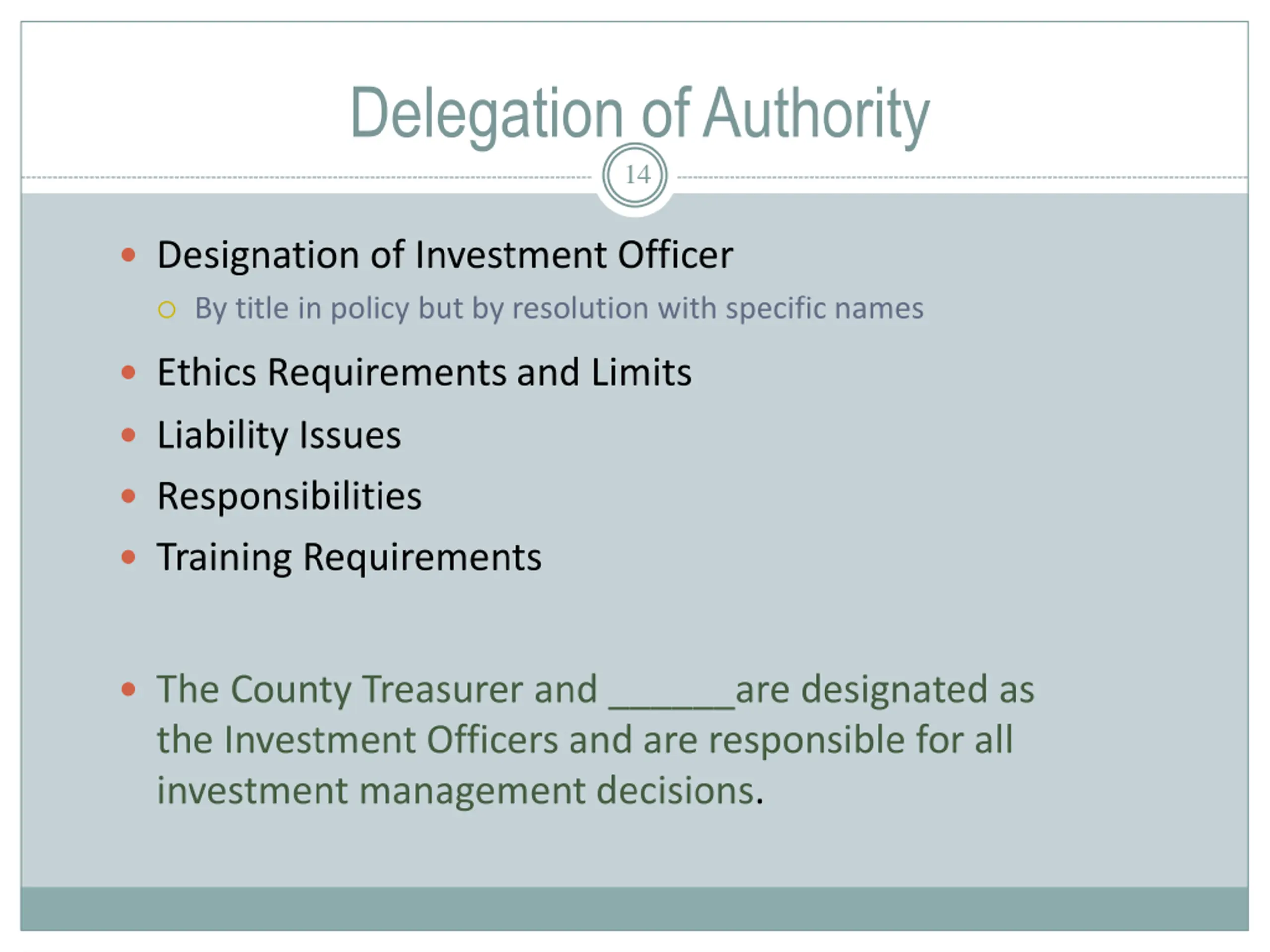 Delegation of Authority 14 Designation of Investment Officer By title in policy but by resolution with specific names Ethics Requirements and Limits Liability Issues Responsibilities Training Requirements The County Treasurer and ______are designated as the Investment Officers and are responsible for all investment management decisions.