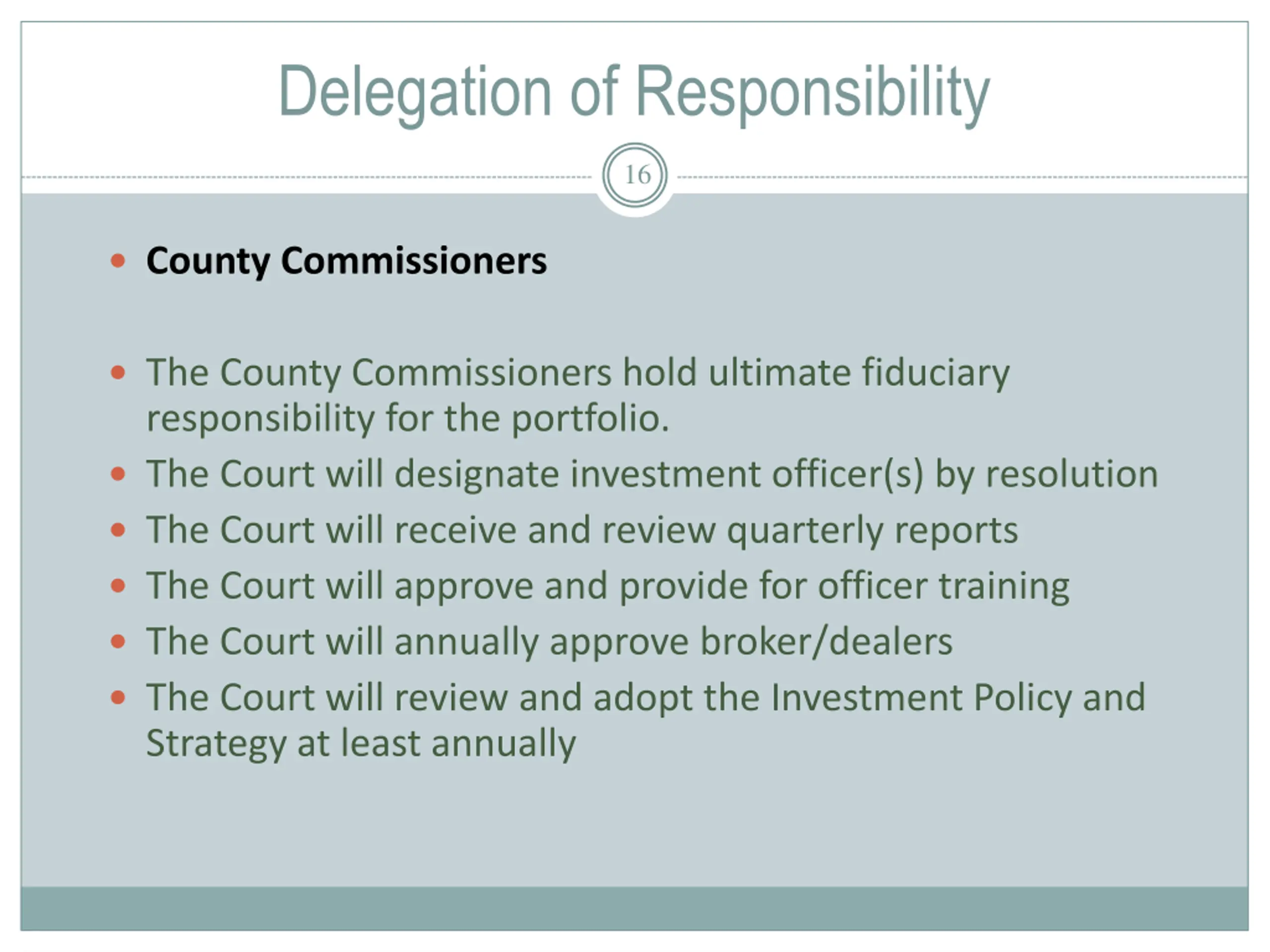 Delegation of Responsibility 16 County Commissioners The County Commissioners hold ultimate fiduciary responsibility for the portfolio. The Court will designate investment officer(s) by resolution The Court will receive and review quarterly reports The Court will approve and provide for officer training The Court will annually approve broker/dealers The Court will review and adopt the Investment Policy and Strategy at least annually