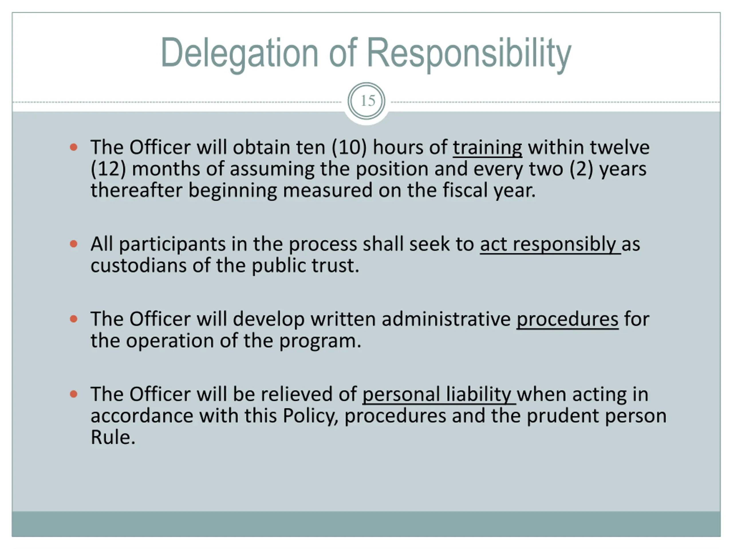 Delegation of Responsibility 15 The Officer will obtain ten (10) hours of training within twelve (12) months of assuming the position and every two (2) years thereafter beginning measured on the fiscal year. All participants in the process shall seek to act responsibly as custodians of the public trust. The Officer will develop written administrative procedures for the operation of the program. The Officer will be relieved of personal liability when acting in accordance with this Policy, procedures and the prudent person Rule.