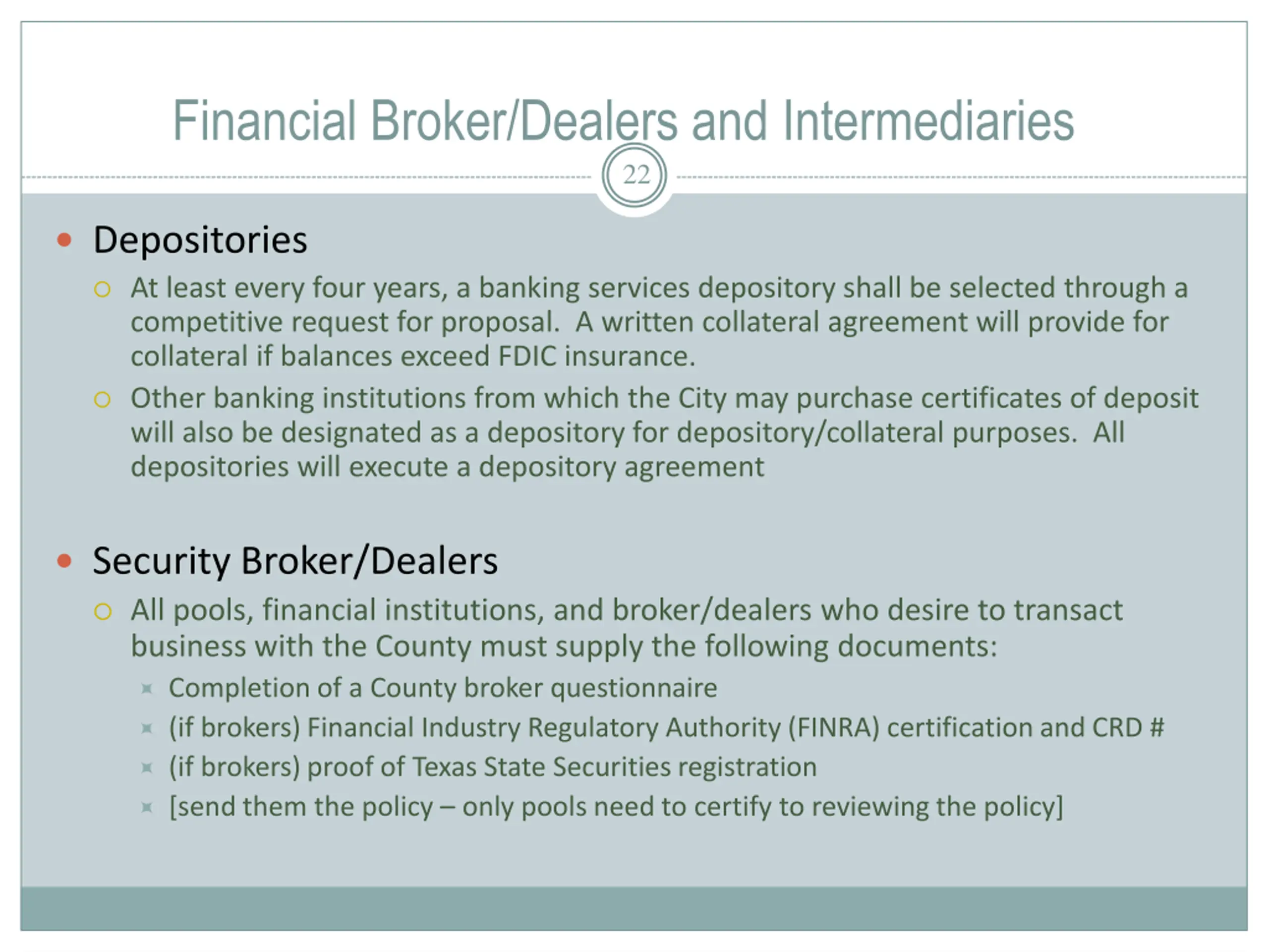 Financial Broker/Dealers and Intermediaries 22 Depositories At least every four years, a banking services depository shall be selected through a competitive request for proposal. A written collateral agreement will provide for collateral if balances exceed FDIC insurance. Other banking institutions from which the City may purchase certificates of deposit will also be designated as a depository for depository/collateral purposes. All depositories will execute a depository agreement Security Broker/Dealers All pools, financial institutions, and broker/dealers who desire to transact business with the County must supply the following documents: Completion of a County broker questionnaire (if brokers) Financial Industry Regulatory Authority (FINRA) certification and CRD # (if brokers) proof of Texas State Securities registration [send them the policy only pools need to certify to reviewing the policy]