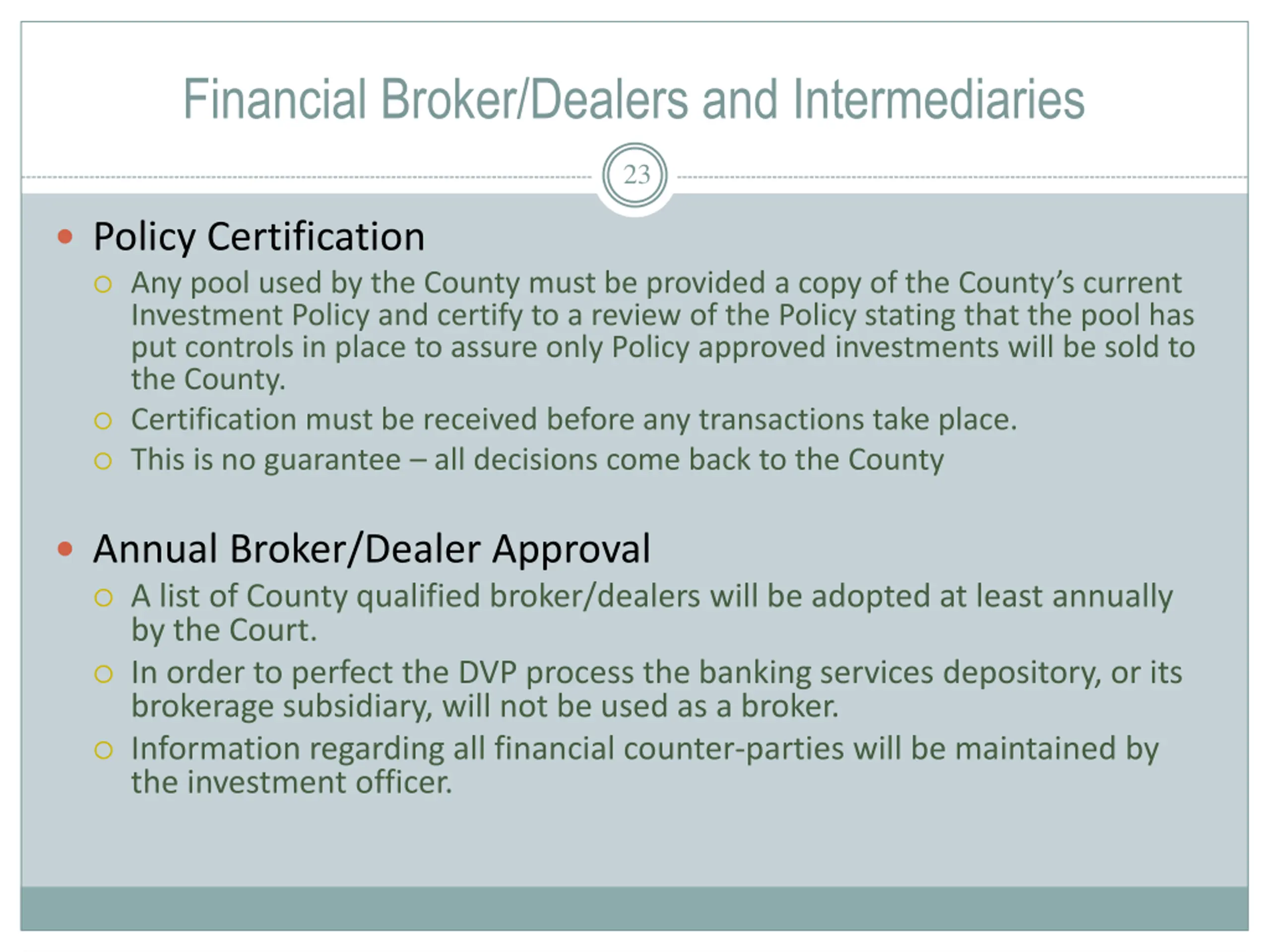 Financial Broker/Dealers and Intermediaries 23 Policy Certification Any pool used by the County must be provided a copy of the County s current Investment Policy and certify to a review of the Policy stating that the pool has put controls in place to assure only Policy approved investments will be sold to the County. Certification must be received before any transactions take place. This is no guarantee all decisions come back to the County Annual Broker/Dealer Approval A list of County qualified broker/dealers will be adopted at least annually by the Court. In order to perfect the DVP process the banking services depository, or its brokerage subsidiary, will not be used as a broker. Information regarding all financial counter-parties will be maintained by the investment officer.