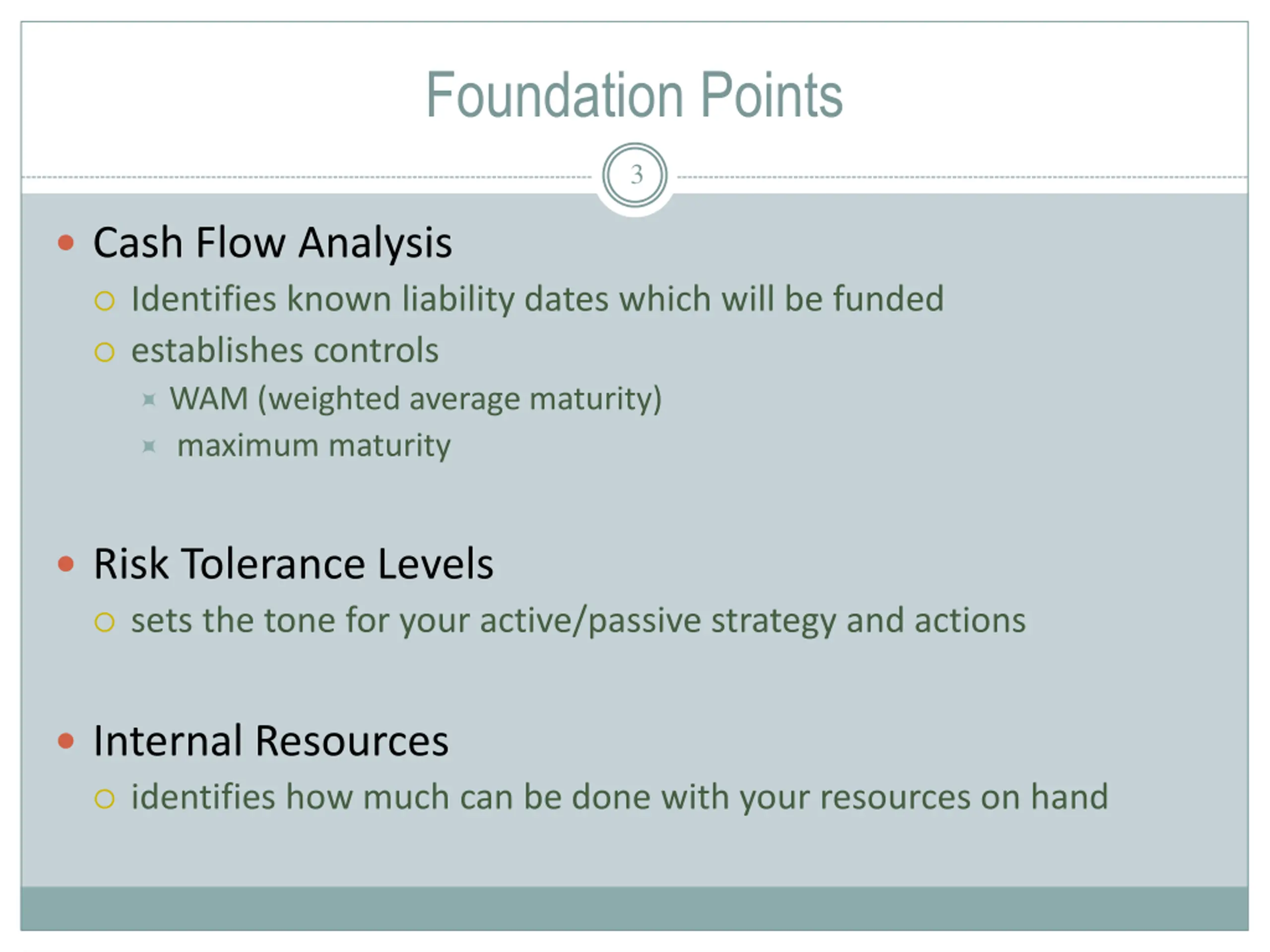 Foundation Points 3 Cash Flow Analysis Identifies known liability dates which will be funded establishes controls WAM (weighted average maturity) maximum maturity Risk Tolerance Levels sets the tone for your active/passive strategy and actions Internal Resources identifies how much can be done with your resources on hand