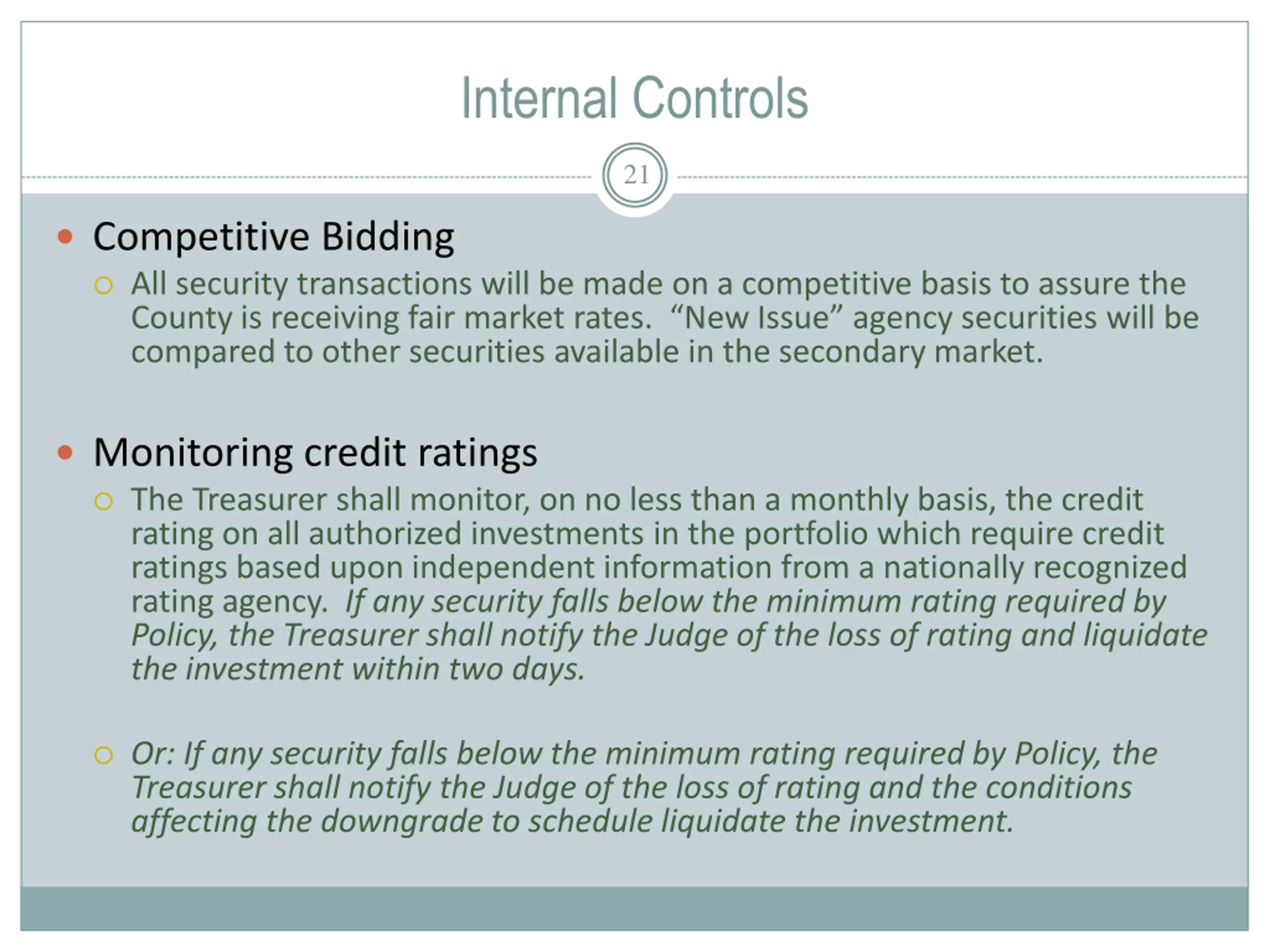 Internal Controls 21 Competitive Bidding All security transactions will be made on a competitive basis to assure the County is receiving fair market rates. New Issue agency securities will be compared to other securities available in the secondary market. Monitoring credit ratings The Treasurer shall monitor, on no less than a monthly basis, the credit rating on all authorized investments in the portfolio which require credit ratings based upon independent information from a nationally recognized rating agency. If any security falls below the minimum rating required by Policy, the Treasurer shall notify the Judge of the loss of rating and liquidate the investment within two days. Or: If any security falls below the minimum rating required by Policy, the Treasurer shall notify the Judge of the loss of rating and the conditions affecting the downgrade to schedule liquidate the investment.
