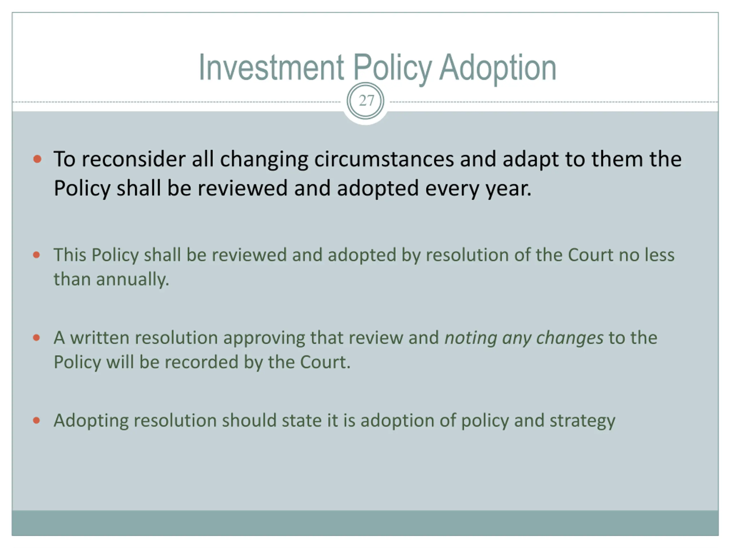 Investment Policy Adoption 27 To reconsider all changing circumstances and adapt to them the Policy shall be reviewed and adopted every year. This Policy shall be reviewed and adopted by resolution of the Court no less than annually. A written resolution approving that review and noting any changes to the Policy will be recorded by the Court. Adopting resolution should state it is adoption of policy and strategy